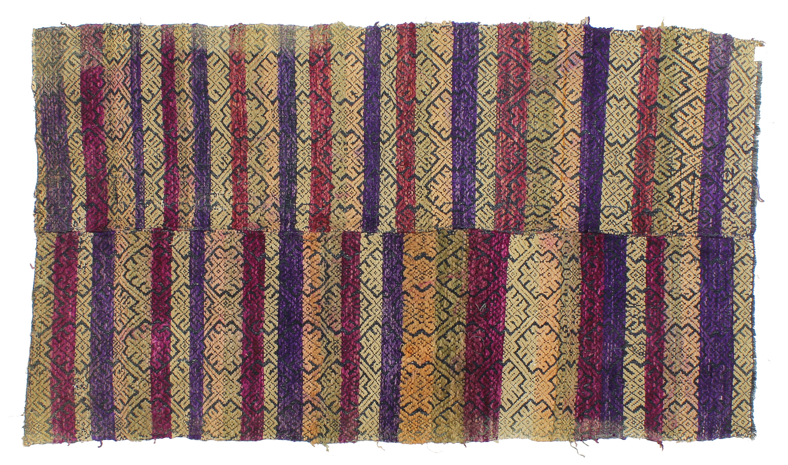 From the mountains of Northern Vietnam, resides the Tay ethnicity. Some may refer to them as “White Tay”. The people of this ethnicity are typically known for their technical embroidery and handwoven blankets, used by the people for warmth during the rainy season of Vietnam. Where temperatures can get well below freezing. Their textiles can be most commonly recognized by their diverse range of colors from dyes that they produce from surrounding plants and trees in the environment. A few examples are betel, mango, and coffee leaves. What makes this quilt so impressive is that the textile is woven from silk. A single cocoon of silk from the silk worm will create a thread roughly 2000 feet long. However, it takes over 4,000 cocoons to create a single pound of silk. The silk worm is only alive for roughly 1 week before it begins its transformation into a moth. Silk worms are only active from the late spring to early fall months due to their intolerance to heat and cold. Thus it is an outstanding effort on behalf of the community to create such a wonderful textile. This textile features a stunning central woven panel consisting of two bands roughly 13″ each. Many blankets in their full form will have a boarder around the central panel to increase its size. Sometimes the boarder may be removed before selling, or replaced with a newer boarder when the previous gets old. The approximate age is over 50 years. This quilt measures 51″ x 29″