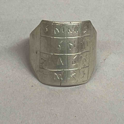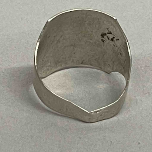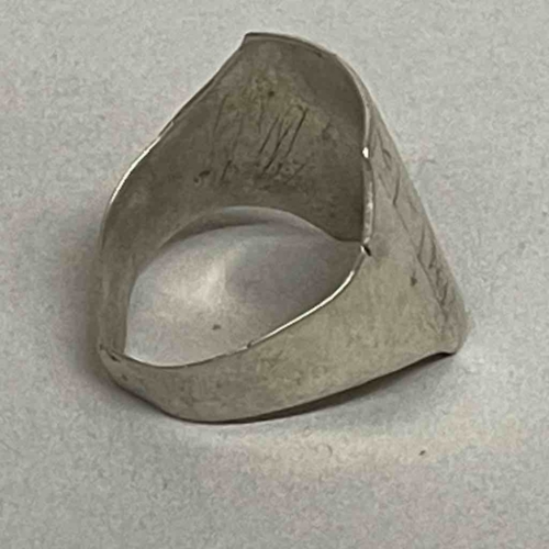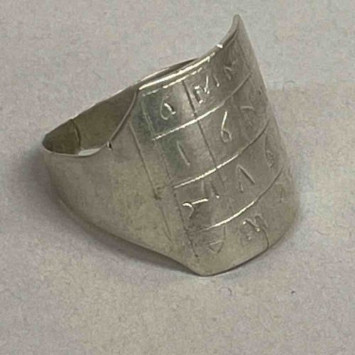 This constructed, etched coin silver ring is commonly worn by Tuareg people as a means of protection from all threats, especially to their health. The symbols on this ring refer to verses in the Koran, verses which serve a protective function to whomever wears the ring. Whether or not the actual significance of the symbols is known the ring still assures the good health, safety and success of him (or her) who wears it. Although its exact age is not known, it clearly was used a long time before we bought it. We call the metal “coin silver” because the source of all silver used in African jewelry is coins, melted down. The silver content is variable but would rarely approach sterling. Size 10.
