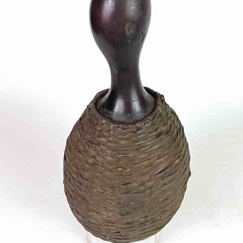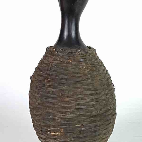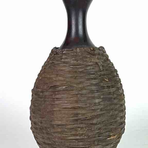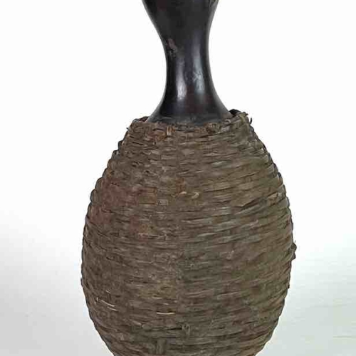 This vintage gourd, used for liquid storage and transport – mostly milk – is covered by basket weaving for extra protection. Milk gourds are common throughout East Africa where cattle is important to the economy and milk consumption is important to their diet. This style of gourd is unique to the Tutsi of Burundi and this one is an old, used one, with great patina and evidence of its use. Including the acrylic stand which we provide, this decorative gourd measures 14 1/2″ tall x 5 3/4″ in diameter. The stand itself is 1 1/2″ of this height => the gourd is therefore 13″ tall.