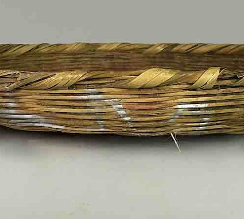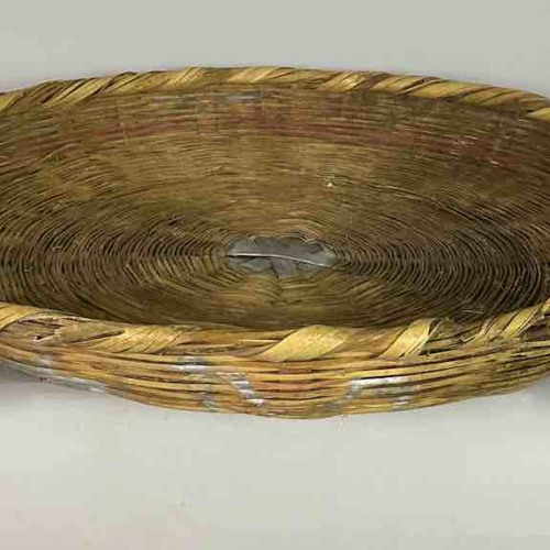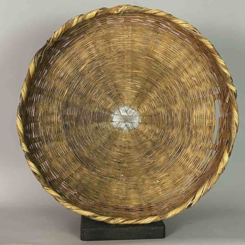 Since my wife is Salvadoran we spend a lot of time in El Salvador. We love that country. Of the many things that appeal to me are the oversize shallow baskets ambulatory merchants use to display the products they sell. They are handwoven of palm fronds in rural areas and are often seen attached to the front of a bicycle. This is a very old one, used for a long time. 4 3/4″ deep x 29″ in diameter (12 x 74 cm)