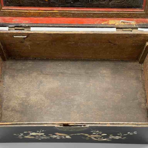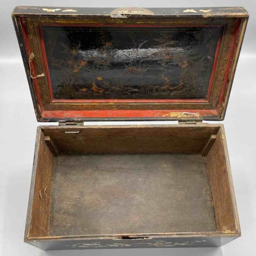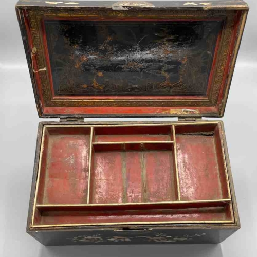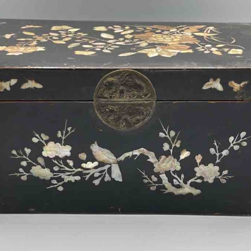 This very old wooden, lacquered box from Viet Nam is solid black on the outside, decorated on all sides with mother of pearl inlays and is decorated on the inside of the top and has a tray with divisions for storing small items of jewelry. 12 x 7 x 5 3/4″ tall (30 x 18 x 15 cm)