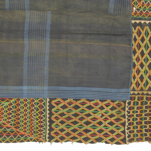 These rectangular textiles are made for and used by the Wodaabe people of Niger. These rectangular textiles are used by women as a wraparound skirt. This diaphanous cloth is first woven of very fine threads in narrow bands, then sewn together sided by side into a larger cloth before it is dyed indigo. The intricate embroidery is then added to the corner as a way of individualizing and embellishing the skirt. This textile measures: 42″ x 25″