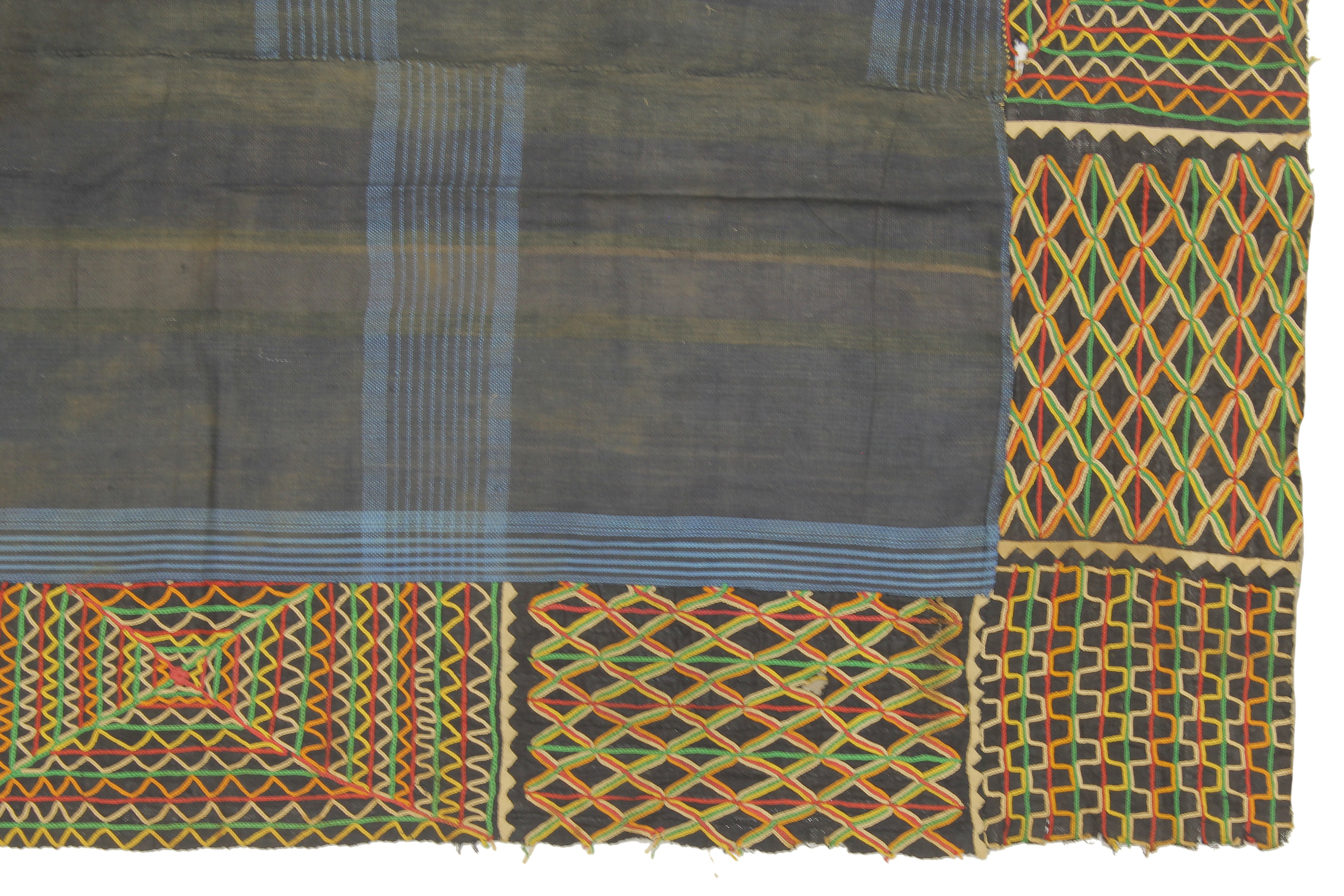 These rectangular textiles are made for and used by the Wodaabe people of Niger. These rectangular textiles are used by women as a wraparound skirt. This diaphanous cloth is first woven of very fine threads in narrow bands, then sewn together sided by side into a larger cloth before it is dyed indigo. The intricate embroidery is then added to the corner as a way of individualizing and embellishing the skirt. This textile measures: 42″ x 25″