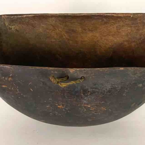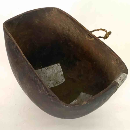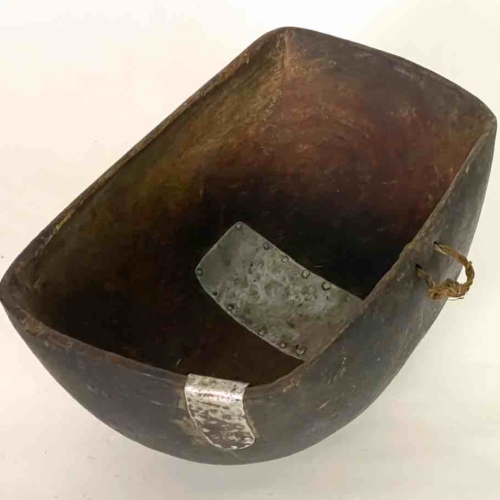 This vintage vessel was handcarved from wood by the Turkana people deep in northern Kenya. It was used by the Turkana people for a long time as evidenced by its patina, all over the sides and rim, where it was most often held. Many of these bowls have repoussé repairs, further proof of their age and use. This container measures: 10 1/2 x 6 3/4 x 5″ (27 x 17 x 13 cm)