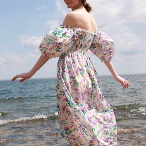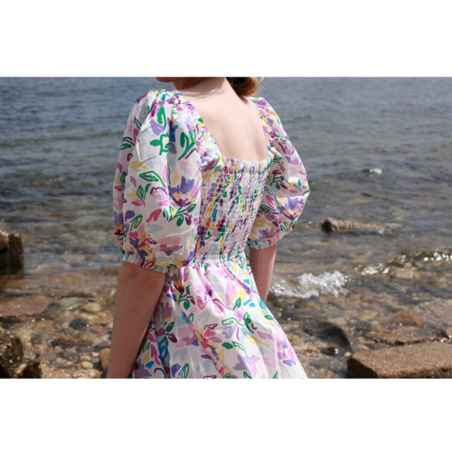 Designed in a lightweight cotton-silk fabric, hand illustrated floral dress features puff sleeves, a smocked bodice, and an easy fit-and-flare shape. You can wear it with the sleeves on or off the shoulder.