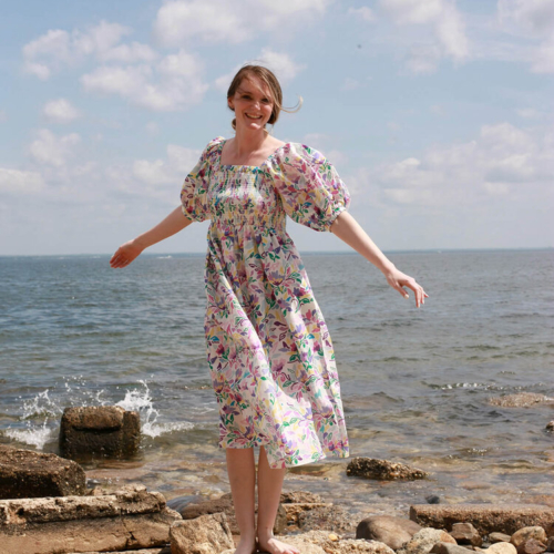 Designed in a lightweight cotton-silk fabric, hand illustrated floral dress features puff sleeves, a smocked bodice, and an easy fit-and-flare shape. You can wear it with the sleeves on or off the shoulder.