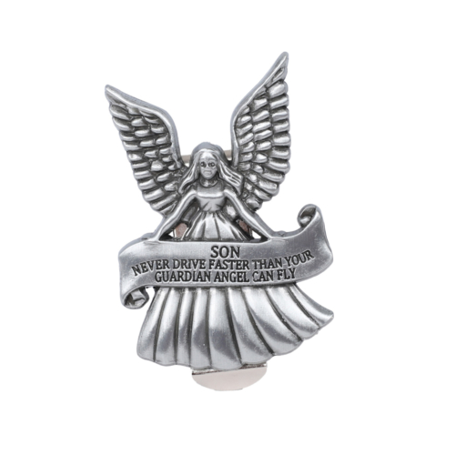 This elegant silver visor clip is a heartfelt reminder of love, protection, and faith. Beautifully crafted, it features a delicate angel holding a flowing banner that reads, Son, never drive faster than your guardian angel can fly. Designed to clip securely onto any car visor, this meaningful accessory offers constant encouragement and spiritual reassurance.
