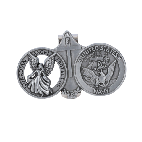 The design features a cross with two round symbols. One displays the official U.S. Navy emblem, while the other holds a guardian angel with the phrase ìGuardian Angel Protect Us.î This combination of military pride and spiritual strength makes the clip both personal and inspiring.