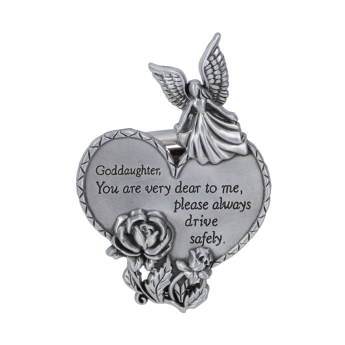 This Heart-Shaped Visor Clip is a beautiful and meaningful accessory, perfect for showing your love and care. Crafted from silver metal, the clip features a delicate angel in the top corner and flowers across the bottom, giving it an elegant and thoughtful design. Engraved with the loving message, Goddaughter, you are very dear to me, please always drive safely, this clip serves as a constant reminder of your love and prayers for her protection on every journey.
