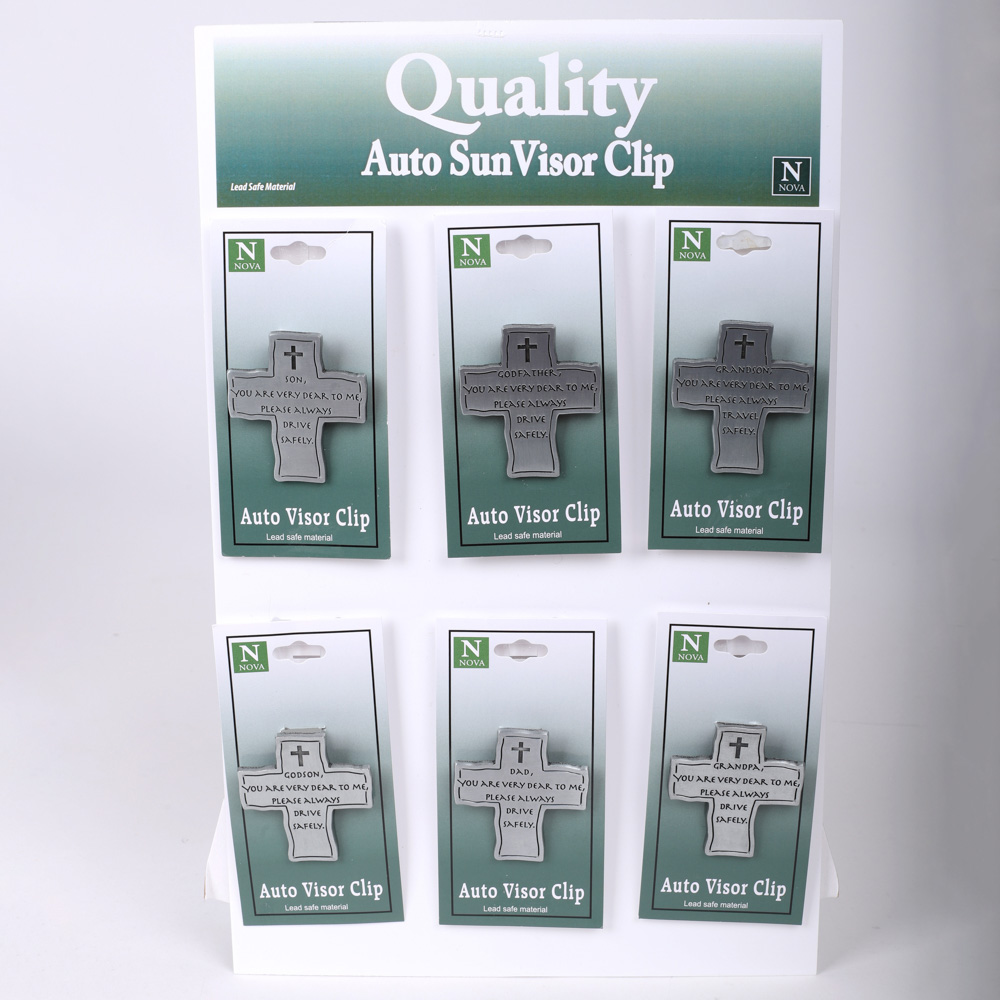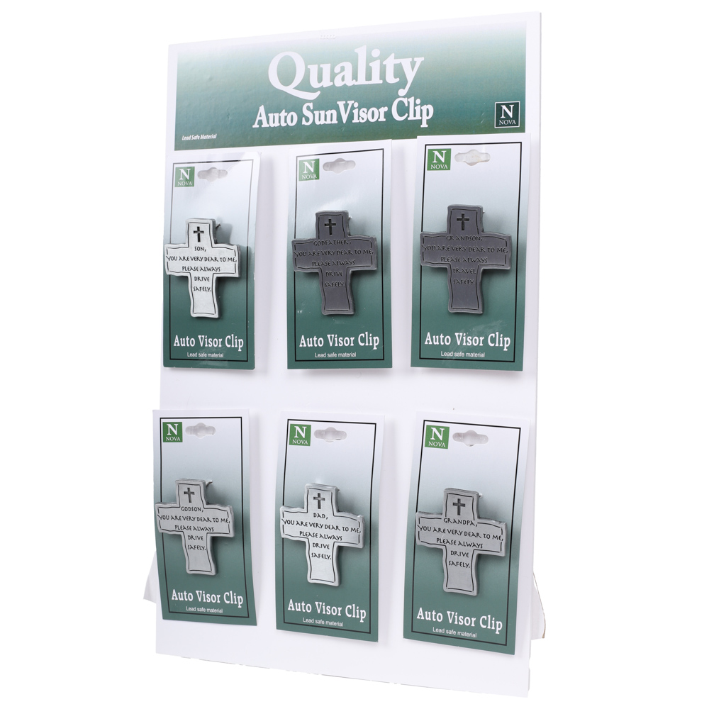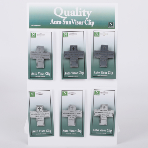 Present your customers with a meaningful Visor Clip Assortment that includes 24 clips in total. This set features 4 pieces each of 6 different designs, including: