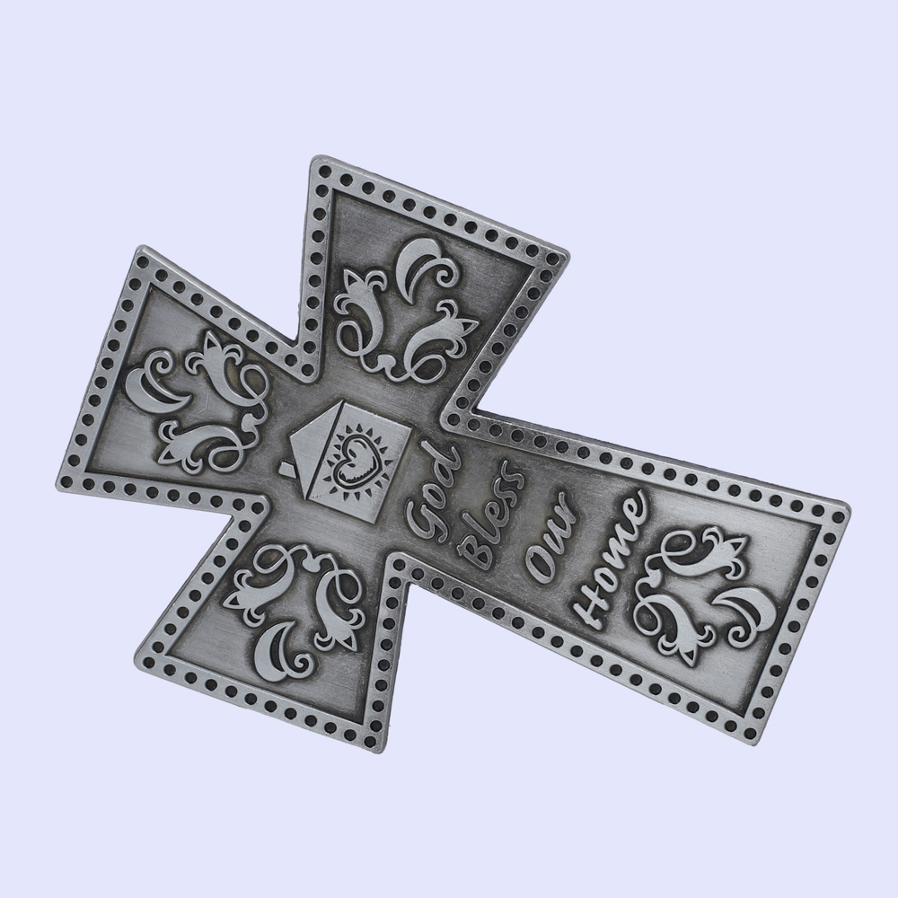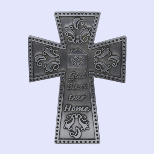 This beautiful Silver Metal Wall Cross is a meaningful addition to any home. Crafted from durable silver-tone metal, it features intricate detailing that adds elegance to its design. The cross is engraved with the words God bless our home, making it a perfect reminder of the divine presence in one’s home. A simple yet impactful image of a home accompanies the inscription, symbolizing warmth, love, and faith. Measuring 3.675L x 0.25W x 4.875H, this cross is ideal for display in living rooms, foyers, or prayer spaces. It serves as both a decorative piece and a reminder to invite Godís blessings into the household. Whether youíre celebrating a new home, a housewarming, or simply wishing to add a touch of faith to your living space, this cross makes a thoughtful gift. Itís a timeless and meaningful keepsake that will bring comfort and a sense of spiritual presence to any home.