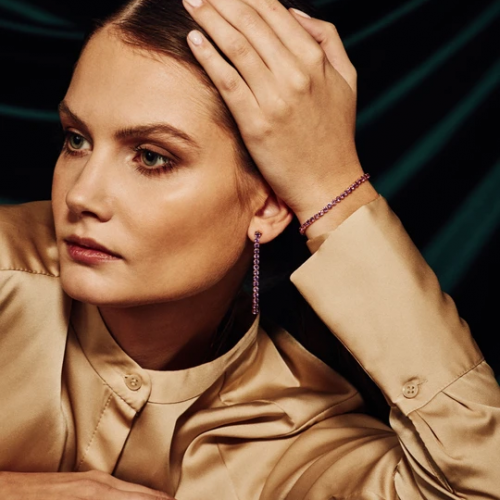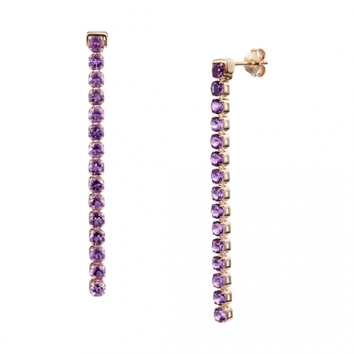 This pair of eye-catching earrings feature round, perfect pearl-size natural amethyst gemstones that line up neatly on two 18 ct rose gold vermeil earrings with 15 amethyst gemstones each side.