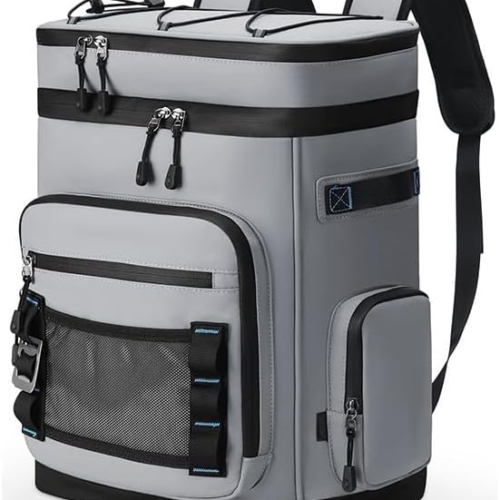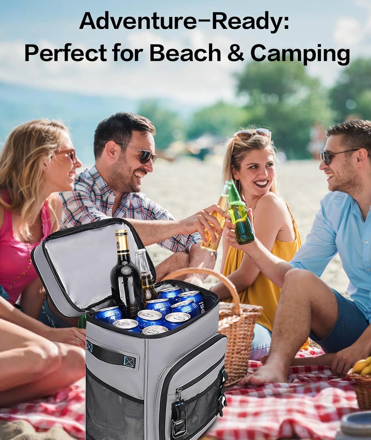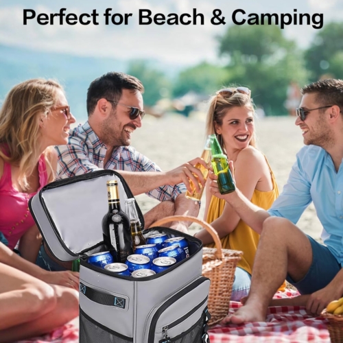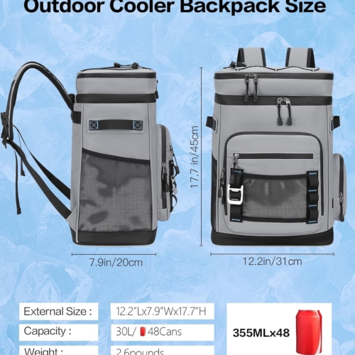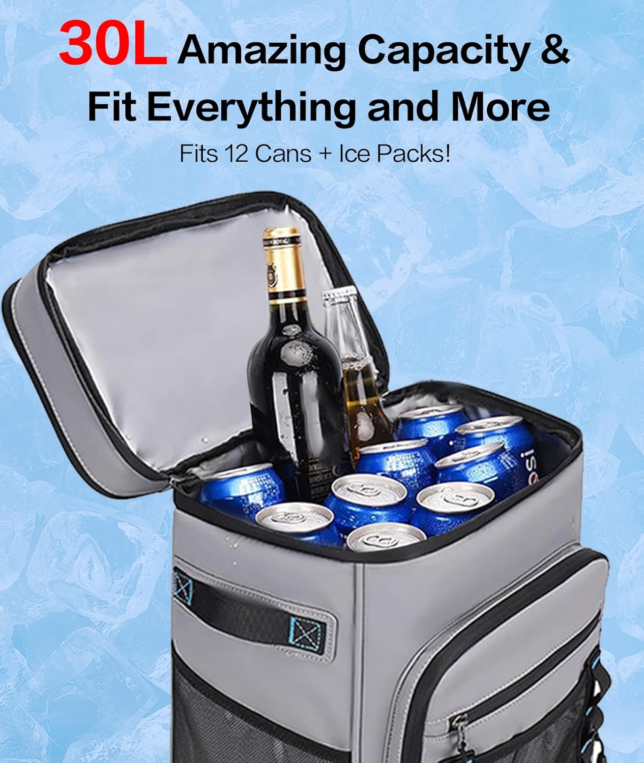 3-Layer Insulated Cooler Backpack: Premium outer shell with heat-deflecting technology + Deep Freeze interior lining + leak-proof barrier keeps ice frozen for 24+ hours (tested in 90°F/32°C). Perfect for camping trips, beach parties, tailgating, fishing, and outdoor adventures.30L Large Capacity Cooler Backpack: Holds 12 cans (standard 12oz) + 4 ice packs with extra space for snacks. Fits 2 wine bottles vertically. Dimensions: 17.7″ tall x 12.2″ wide – ideal for family outings, picnics, BBQs, and sports events.Rugged Yet Lightweight (Only 2.6 lbs): Made with water-resistant, tear-resistant fabric that’s easy to wipe clean. Reinforced stitching withstands hiking, boating, and RV trips. Multiple pockets for utensils, phones, and dry storage.100% Leak-Proof Zipper System: Air-tight double-layer zipper prevents spills (tested with liquids at 45° angle). Built-in bottle opener on zipper pull – no more searching for tools!Ergonomic Cooler Backpack Design: 3D mesh padded back + adjustable wide straps distribute weight evenly. Breathable back panel reduces sweating during long hikes, festivals, or all-day adventures.