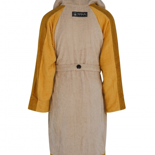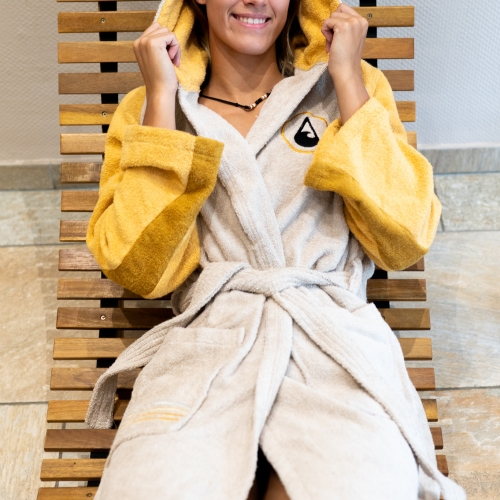Stylish bathrobe with hood and raglan sleeves. A real eye-catcher. Made of fluffy 100% cotton that is certified according to Oeko Tex Standard 100. Comfortable on the skin and functional as usual. Two-tone hood with double fabric for cozy warmth on the head. The two side pockets offer space for utensils such as shampoo or brush or your cold hands. With the practical button on the back you can fix the belt so that it cannot slip out of the loops on the side. The certified cotton material is particularly fluffy and skin-friendly. Sustainability and naturalness in the selection of raw materials play a major role for us – not just for the sake of your skin. Whether after showering – during sports and at home, in the leisure pool, in the thermal baths, during water sports, in the sauna, in the fitness studio, while camping, etc. Your WAVE HAWAII bathrobe always keeps you warm and doesn’t leave you standing in the wet.