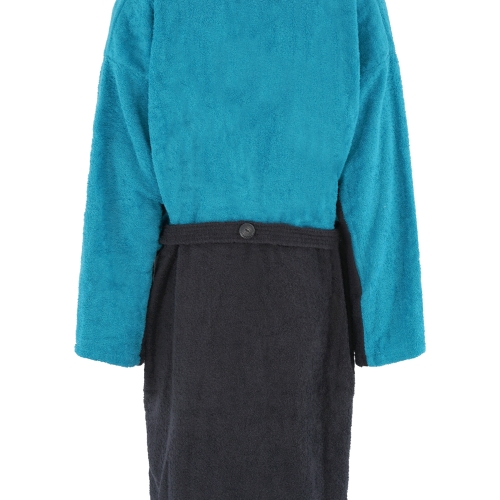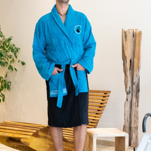 Stylish bathrobe and a real eye-catcher. Made of fluffy 100% cotton that is certified according to Oeko Tex Standard 100. Comfortable on the skin and functional as usual. The two side pockets offer space for utensils such as shampoo or brush or your cold hands. With the practical button on the back you can fix the belt so that it cannot slip out of the loops on the side. The certified cotton material is particularly fluffy and skin-friendly. Sustainability and naturalness in the selection of raw materials play a major role for us – not just for the sake of your skin. Whether after showering – during sports and at home, in the leisure pool, in the thermal baths, during water sports, in the sauna, in the fitness studio, while camping, etc. Your WAVE HAWAII bathrobe always keeps you warm and doesn’t leave you standing in the wet.