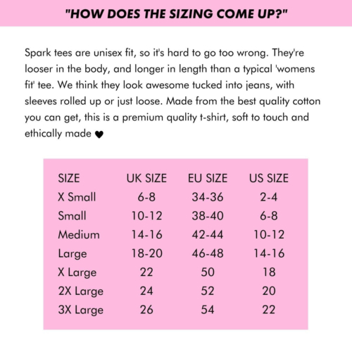 Our premium feminist tees are ethically manufactured and then printed by experts. All our shirts are crafted with airlume combed and ringspun cotton. In English, this just means it’ll be the softest, smoothest tee you’ve ever felt. Expect a classic style and a comfortable retail fit. Our soft textile flex print won’t crack or fade easily, so you can really wear your new favourite shirt to death. Why you’ll love it Unique design, not sold in stores Super soft – made from the highest quality cotton you can get Every purchase helps a woman or girl in need Free UK & EU shipping on all orders over £70! We want you to love your items, so if anything you buy isn’t perfect, just let our friendly support team know over email or live chat and they’ll do everything in their power to fix the problem or give you a full refund.
