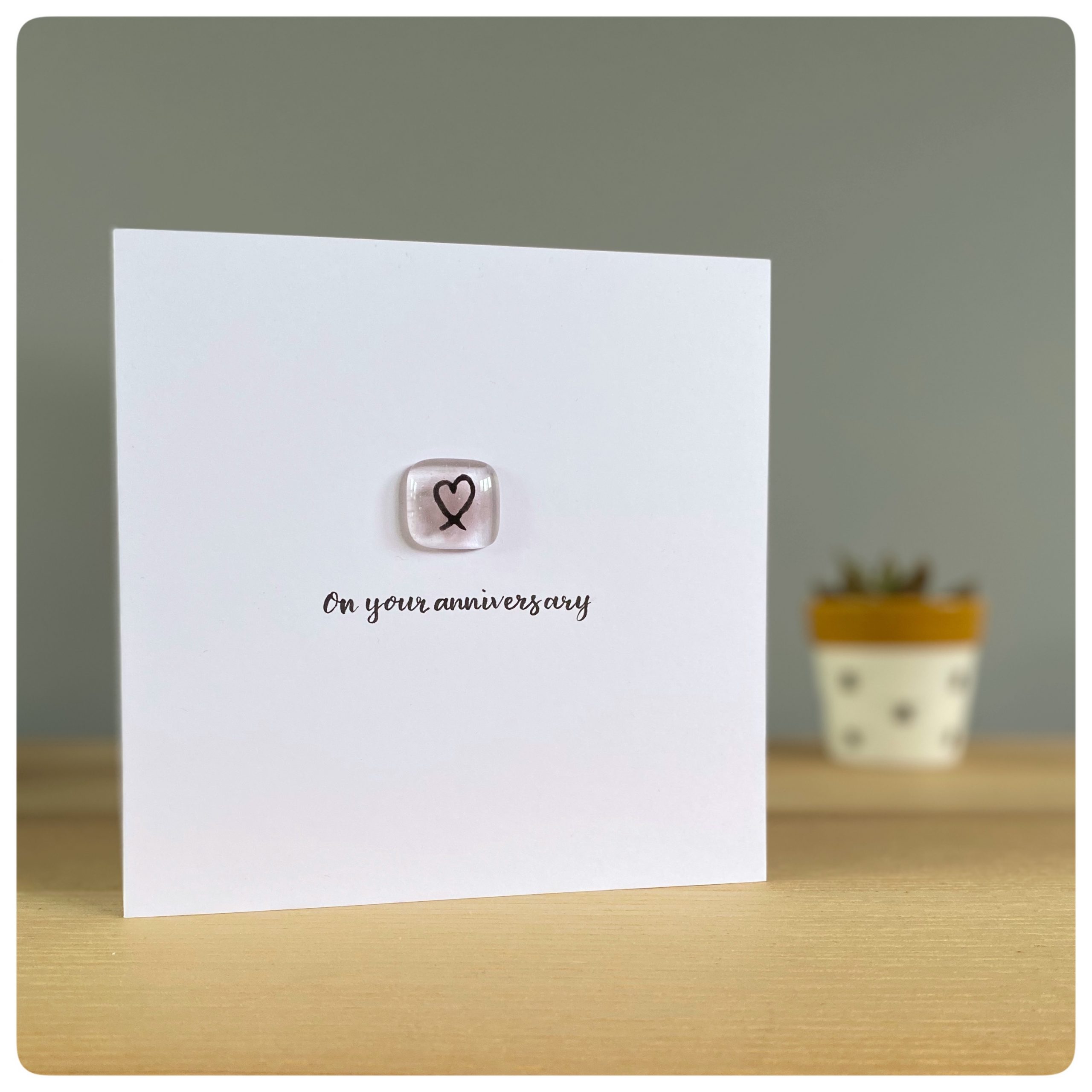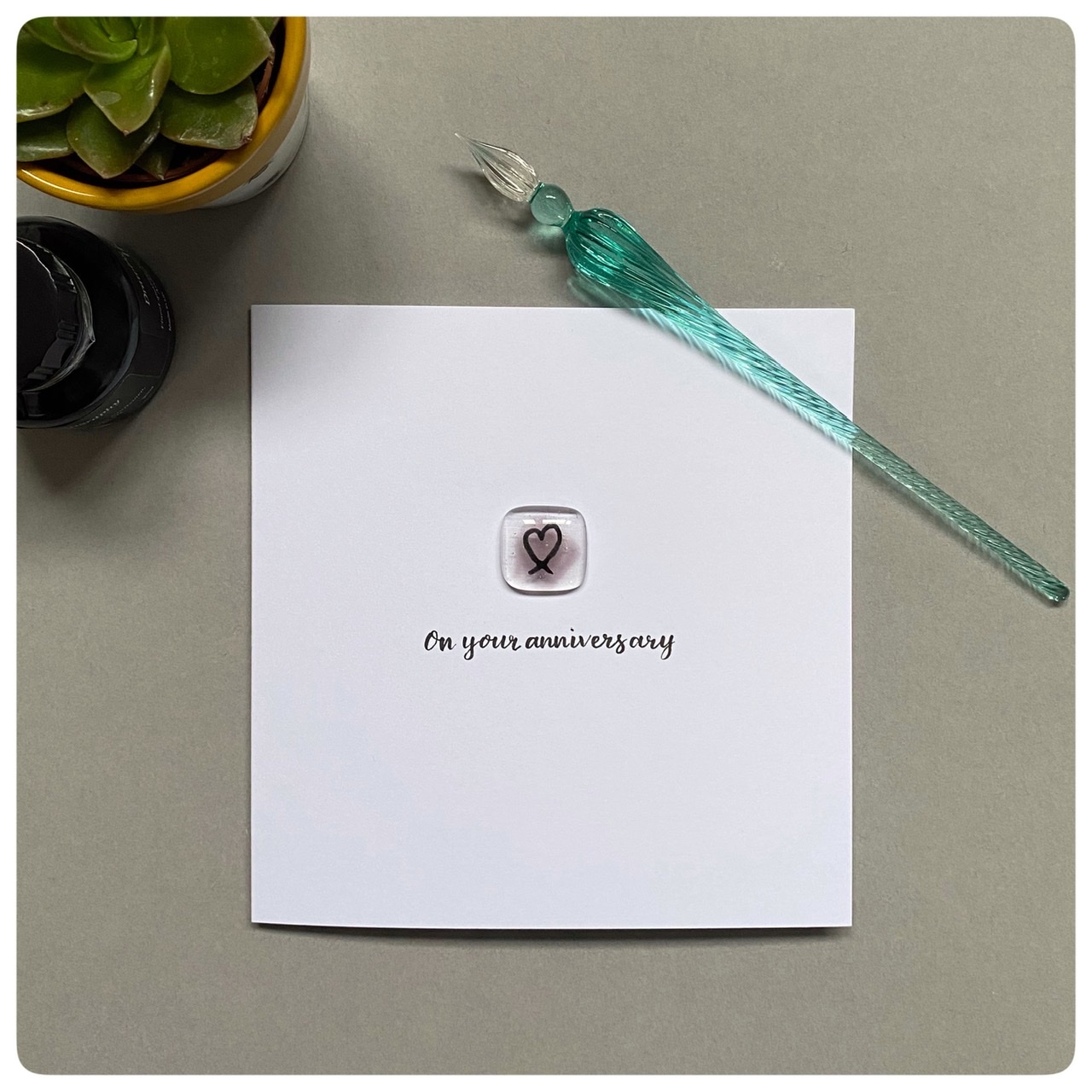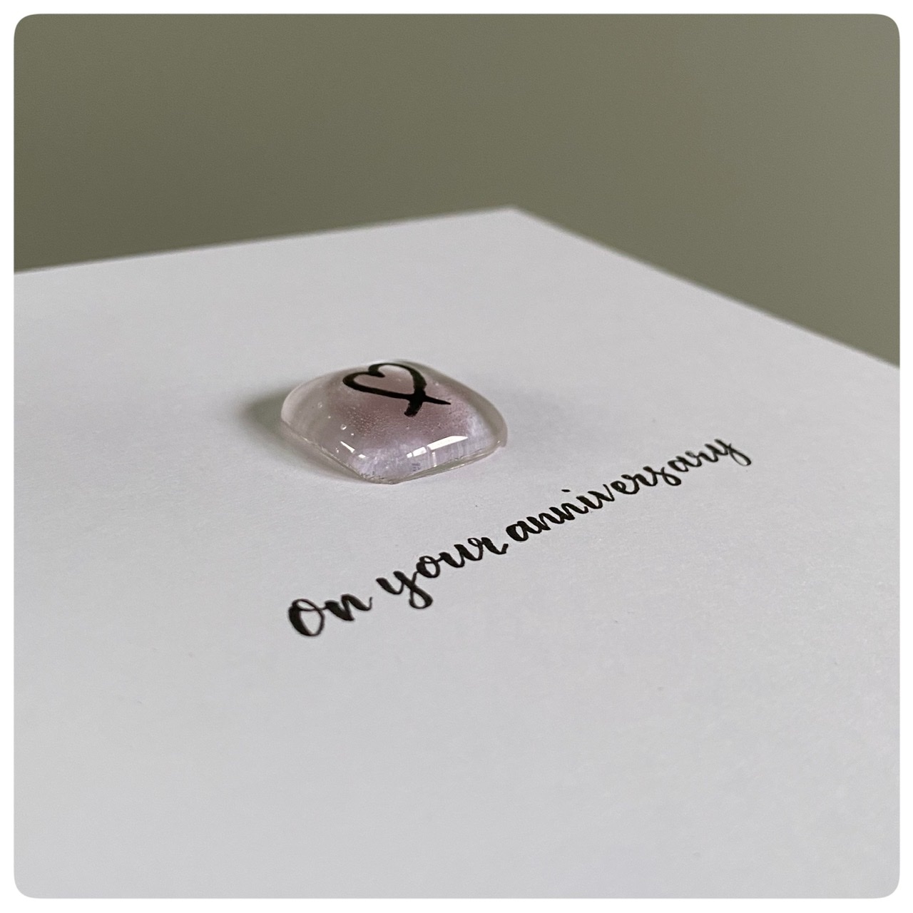 A wedding anniversary greetings card with the message ‘on your anniversary’ and a glass tile with a heart hand painted on it.