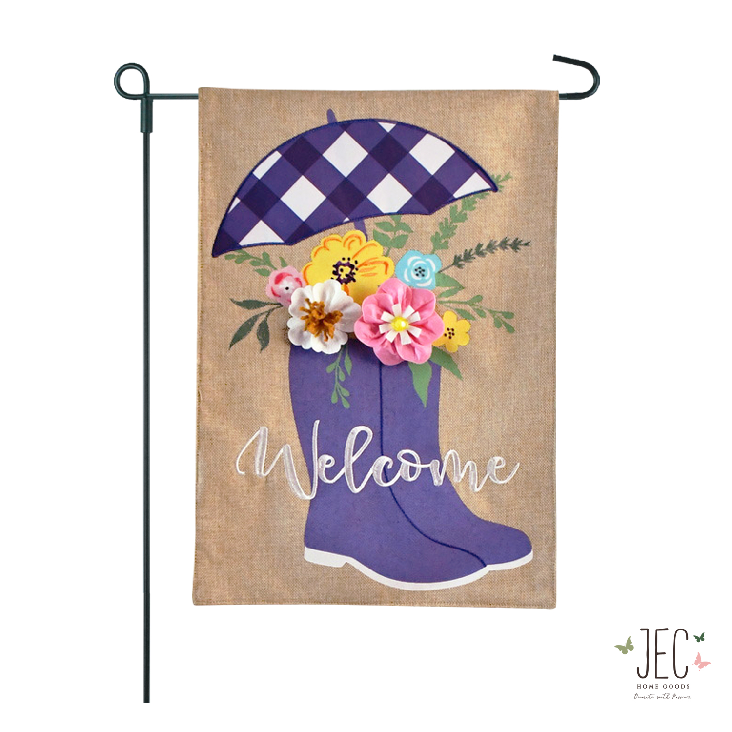 The cutest spring flag featuring a purple pair of rain boots and matching umbrella blossoming a bouquet of brightly colored spring flowers