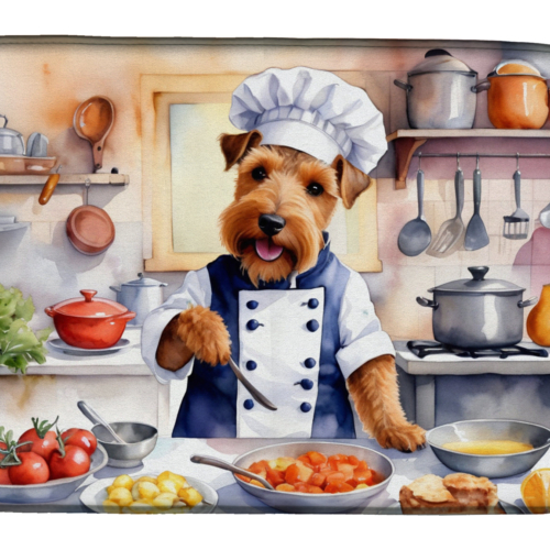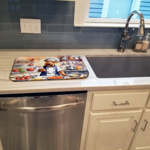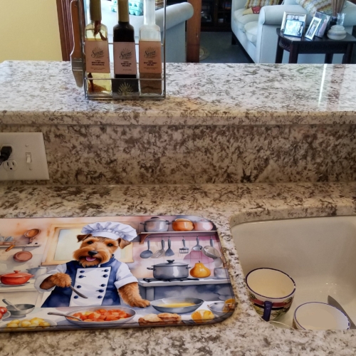 Dish Drying Mat featuring breed specific Welsh Terrier artwork. Say goodbye to messy countertops and soggy dish towels with our innovative dish drying mat. Our high-quality dish drying pad is designed to keep your countertops dry while offering a stylish and efficient solution. Whether you’re air drying dishes, glasses, stemware, silverware, pots, pans, bottles, or even fruits and vegetables, our dish mat is the perfect choice. The 14 inches x 22 inches size fits most counters and dish drying racks, and the non-slip design ensures stability. Made with water-absorbent polyester and a polyurethane foam insert, our dish drying mat is not only functional but also durable. It’s machine washable and printed in the USA for long-lasting use. The beautiful artwork adds flair to your kitchen decor, making it a perfect housewarming gift or present for any occasion. Upgrade your kitchen experience with our absorbent and versatile dish drying mat.