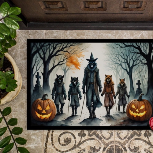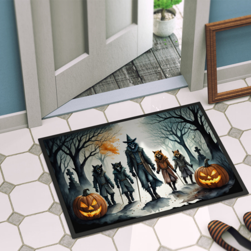 Celebrate Halloween with this Halloween Doormat. Welcome your guests in style with our Artwork Door Mat, designed to withstand almost any weather condition. This mat, measuring approximately 24 by 36 inches, is held together by durable black binding tape. Its top layer, composed of polyester felt, is dyed with the eye-catching image you see on the mat. A few layers below provide the mat with stability, while its rubber bottom is stamped to help prevent slipping and ensures safety. Our mat works wonderfully as both an indoor or outdoor door mat. For cleaning, simply hose it off with water or use a power washer – no need for any cleaner that produces suds. Avoid scrubbing with a brush, instead, opt for the vacuum on floor setting. Designed manufactured and printed in the USA, this mat is a perfect addition to your porch, outdoor kitchen, entryway, or any indoor space. Its unique design makes it a charming decorative rug that greets your guests and adds a stylish touch to your home decor.