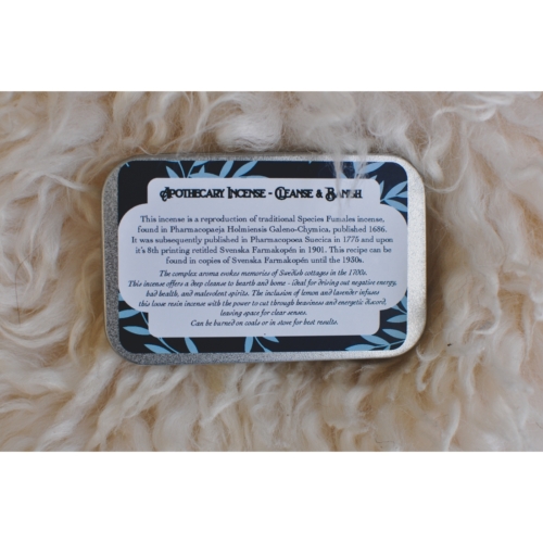 This incense is a reproduction of traditional species fumbles incense, found in pharmacopeia holiness galeno-chemical, published 1686. It was subsequently published in pharmacopeias suecica in 1775 and upon its 8th printing retitled Svenska farmakopén in 1901. This recipe can be found in copies of Svenska farmakopén until the 1930s.
