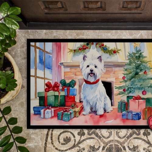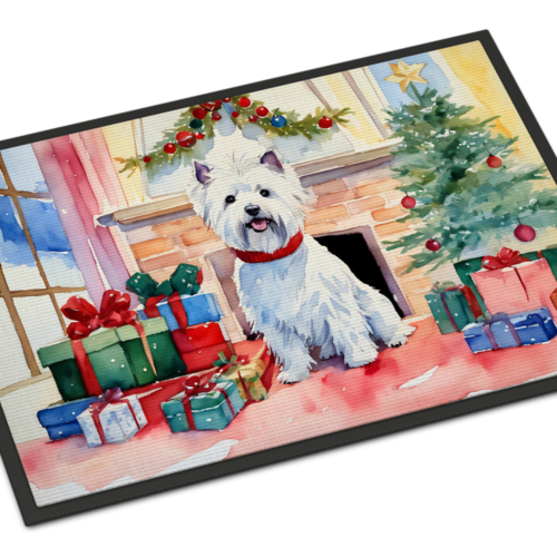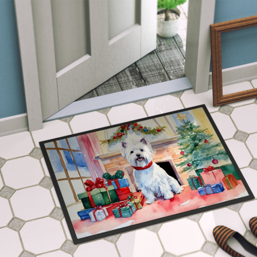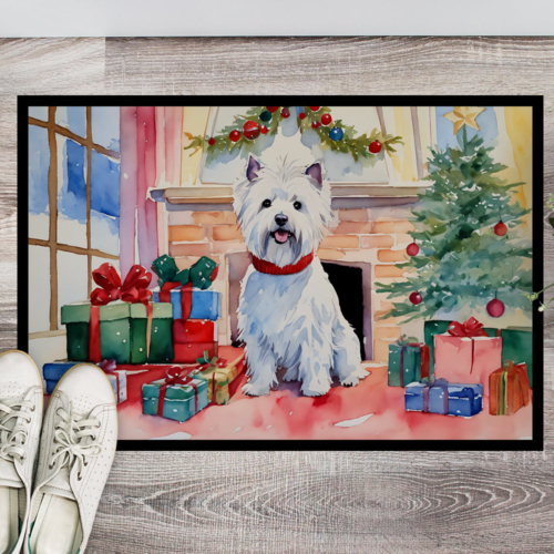 Doormat featuring breed specific West Highland White Terrier artwork. Celebrate Christmas with this Christmas Doormat. Welcome your guests in style with our Artwork Door Mat, designed to withstand almost any weather condition. This mat, measuring approximately 18 by 27 inches, is held together by durable black binding tape. Its top layer, composed of polyester felt, is dyed with the eye-catching image you see on the mat. A few layers below provide the mat with stability, while its rubber bottom is stamped to help prevent slipping and ensures safety. Our mat works wonderfully as both an indoor or outdoor door mat. For cleaning, simply hose it off with water or use a power washer – no need for any cleaner that produces suds. Avoid scrubbing with a brush, instead, opt for the vacuum on floor setting. Designed manufactured and printed in the USA, this mat is a perfect addition to your porch, outdoor kitchen, entryway, or any indoor space. Its unique design makes it a charming decorative rug that greets your guests and adds a stylish touch to your home decor.