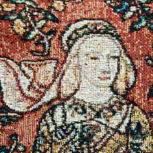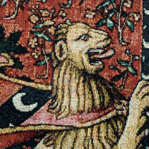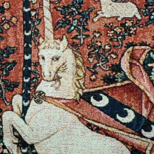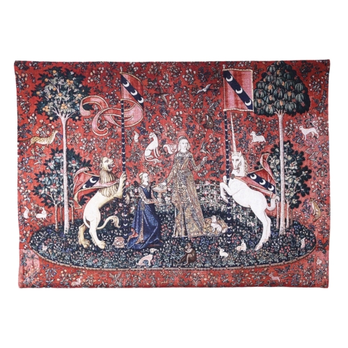 The Lady and the Unicorn, La Dame a la licorne in French, is a series of six tapestries wall hangings designed in Paris and woven in Flanders around 1500 A.D., all consisting of a Lady flanked by a Lion and a Unicorn in various different scenes. The Lady here takes a small sweet from a tray held by her handmaid. Again, the monkey appears at her feet, actually eating another morsel. The lion and unicorn once again frame the scene holding banners. Millefleur Design.