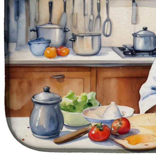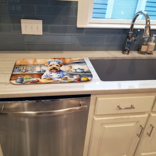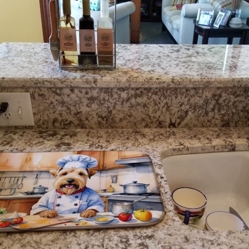 Dish Drying Mat featuring breed specific Wheaten Terrier artwork. Say goodbye to messy countertops and soggy dish towels with our innovative dish drying mat. Our high-quality dish drying pad is designed to keep your countertops dry while offering a stylish and efficient solution. Whether you’re air drying dishes, glasses, stemware, silverware, pots, pans, bottles, or even fruits and vegetables, our dish mat is the perfect choice. The 14 inches x 22 inches size fits most counters and dish drying racks, and the non-slip design ensures stability. Made with water-absorbent polyester and a polyurethane foam insert, our dish drying mat is not only functional but also durable. It’s machine washable and printed in the USA for long-lasting use. The beautiful artwork adds flair to your kitchen decor, making it a perfect housewarming gift or present for any occasion. Upgrade your kitchen experience with our absorbent and versatile dish drying mat.