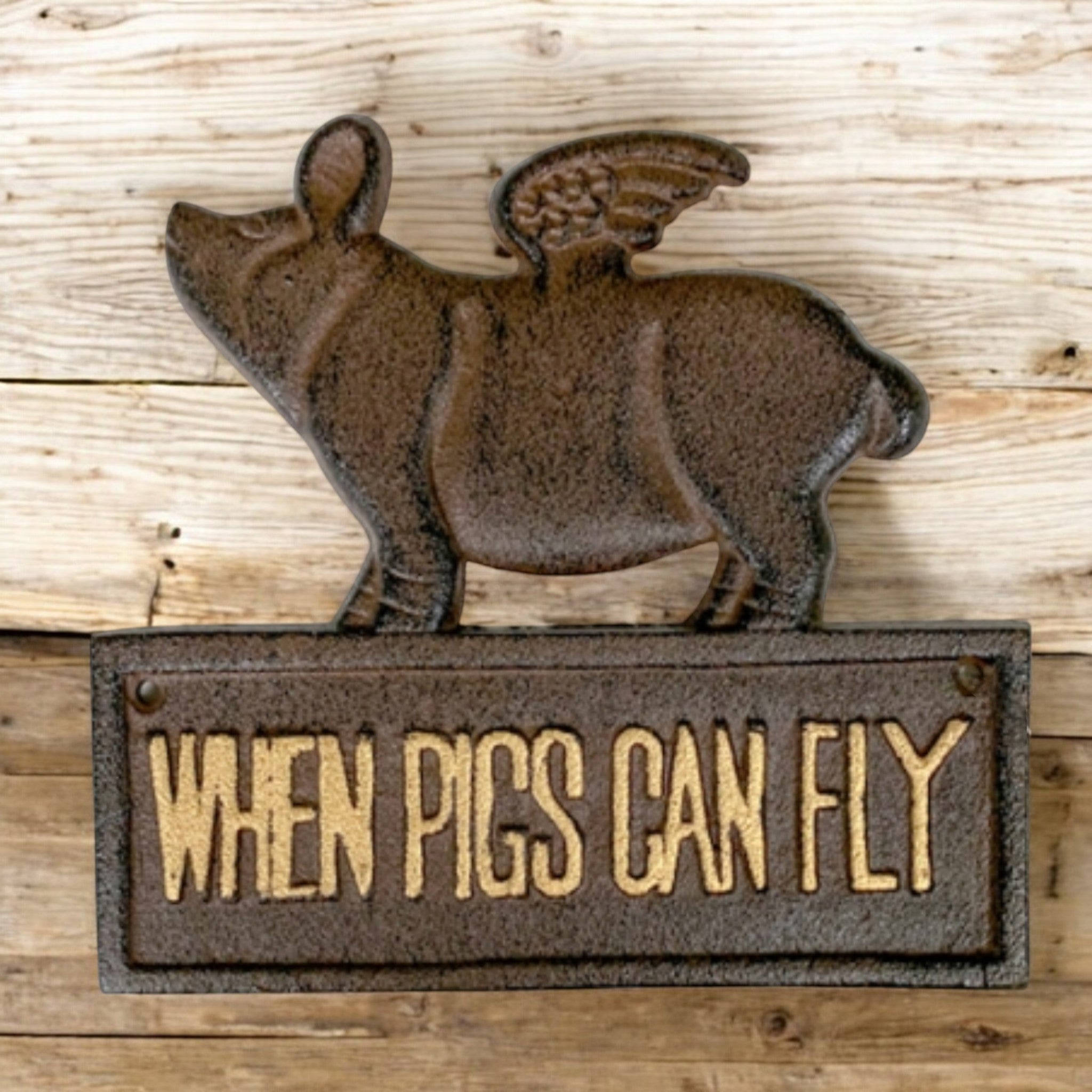 Display a touch of humor with our Cast Iron Plaque: When Pigs Can Fly. This whimsical sign pokes fun at impossible odds, featuring a delightful flying pig design. Forged from solid cast iron, it remains steadfast whether hungdoors or out. Gift it to friends as a playful reminder to dream big, or hang it your own space to spark conversation and smiles.