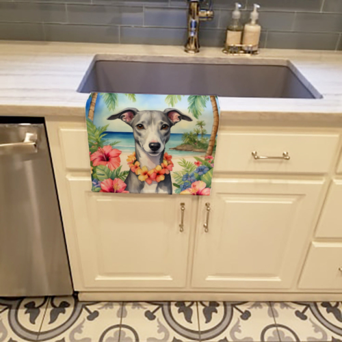 Kitchen Towel featuring breed specific Whippet artwork. Experience the perfect blend of aesthetic appeal and functional excellence with our Plush Velour Kitchen Towels. These are not your ordinary decorative kitchen towels that gather dust. Instead, they are designed to be as practical as they are stylish. The front layer of our towel is constructed from a minky plush polyester, known for its durability and color retention. Unlike conventional kitchen towels, the artwork on our towels is dyed directly into the fabric, ensuring vibrant colors that last. Polish your glassware to a brilliant sparkle using the plush front side of the towel. Flip to the back, crafted from 100% cotton terry loop, to exploit its exceptional absorbency for drying dishes or wiping down counters. Our kitchen towels redefine the concept of functional art, offering lasting quality that maintains the towel’s shape over time. Measuring 15 inches by 25 inches and weighing 2.3 lbs per dozen, these towels deliver an overwhelming sensory experience with their soft, plush, and smooth texture. The edges are meticulously finished with binding, enhancing their durability and visual appeal. For your convenience, these towels are machine washable and can be dried on low heat. After the first wash, the top fabric becomes even softer and fluffier, eliminating the need for ironing. Treat your kitchen to the luxury and functionality it deserves with our plush velour kitchen towels.