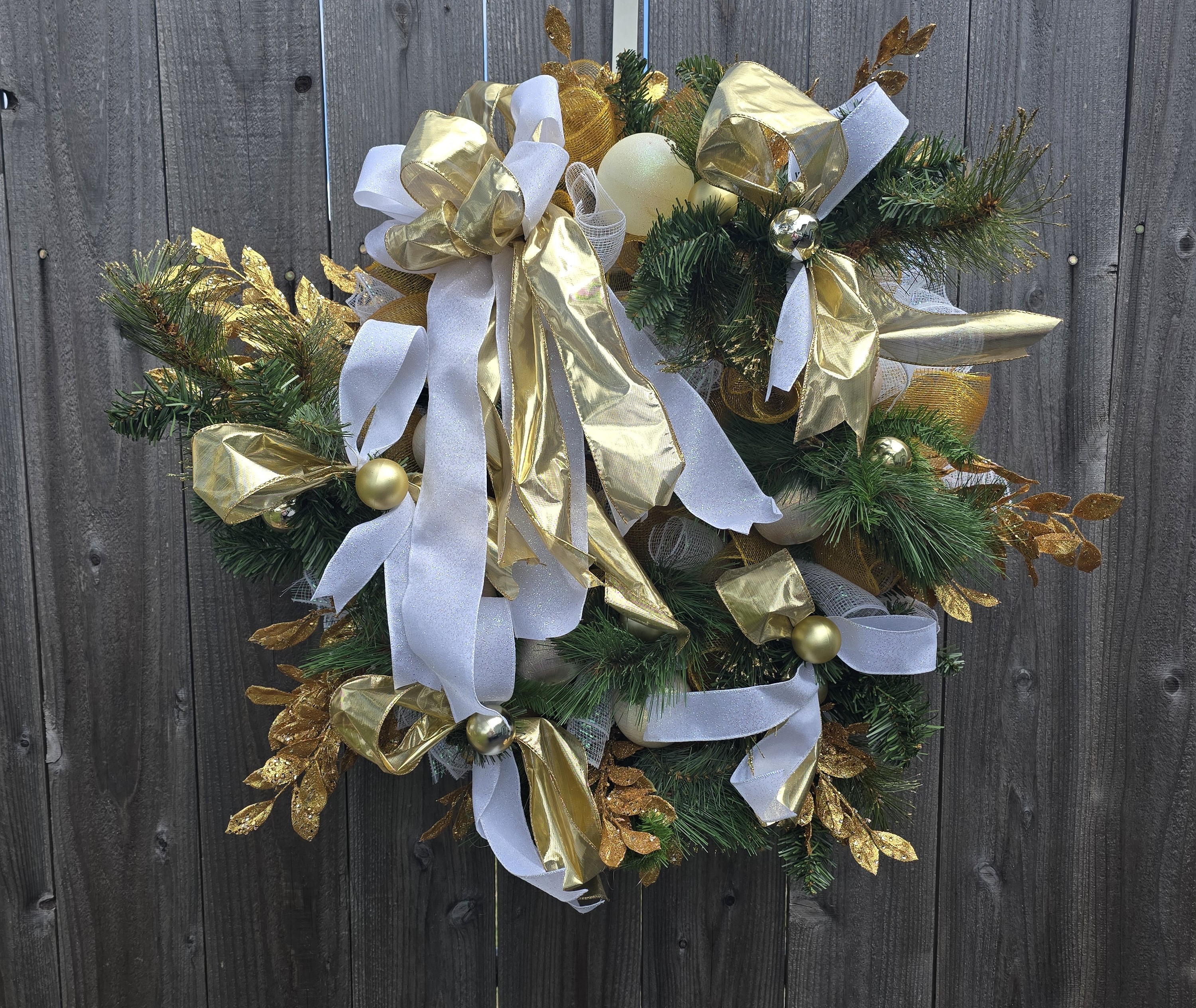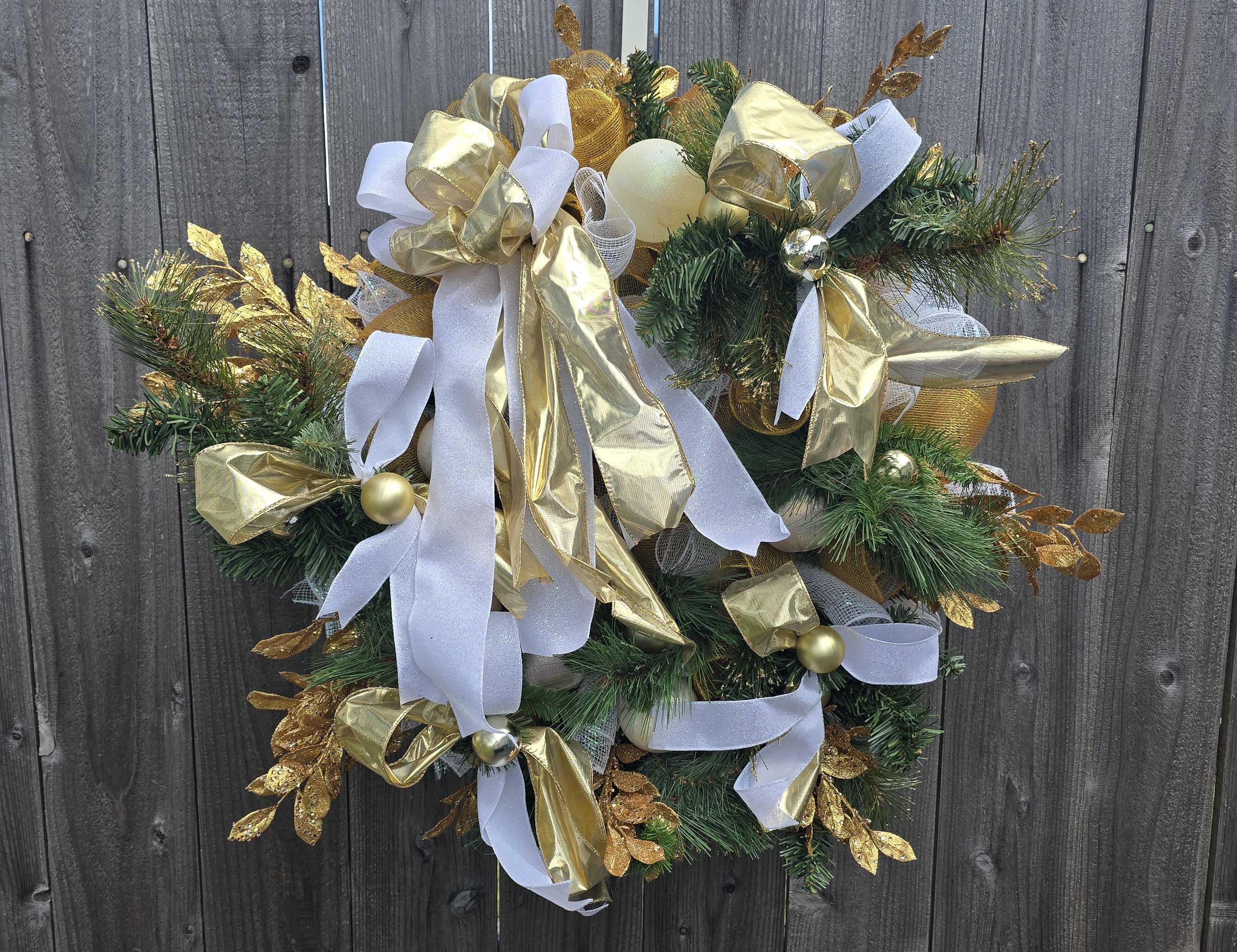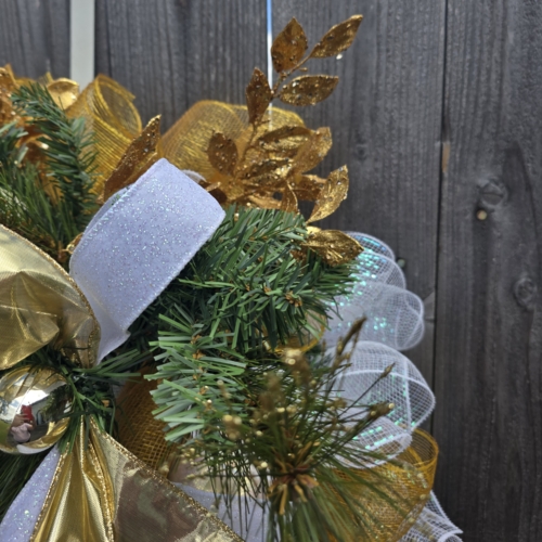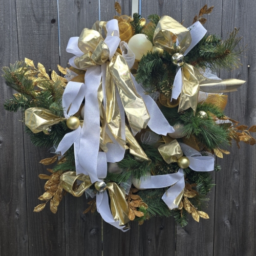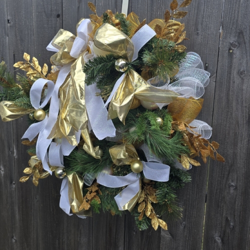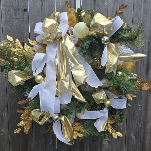 Add a touch of elegance to your holiday decor with our Gold and White Greenery Christmas Wreath. Featuring lush greenery, gold accents, and a classic design. Perfect for any home. The wreath is full of faux greenery, vintage white Christmas balls and gold balls and white and gold ribbon. It is adorned with gold, glitter smilax sprays. The wreath measures approximately 28x28x6 from tip to tip.