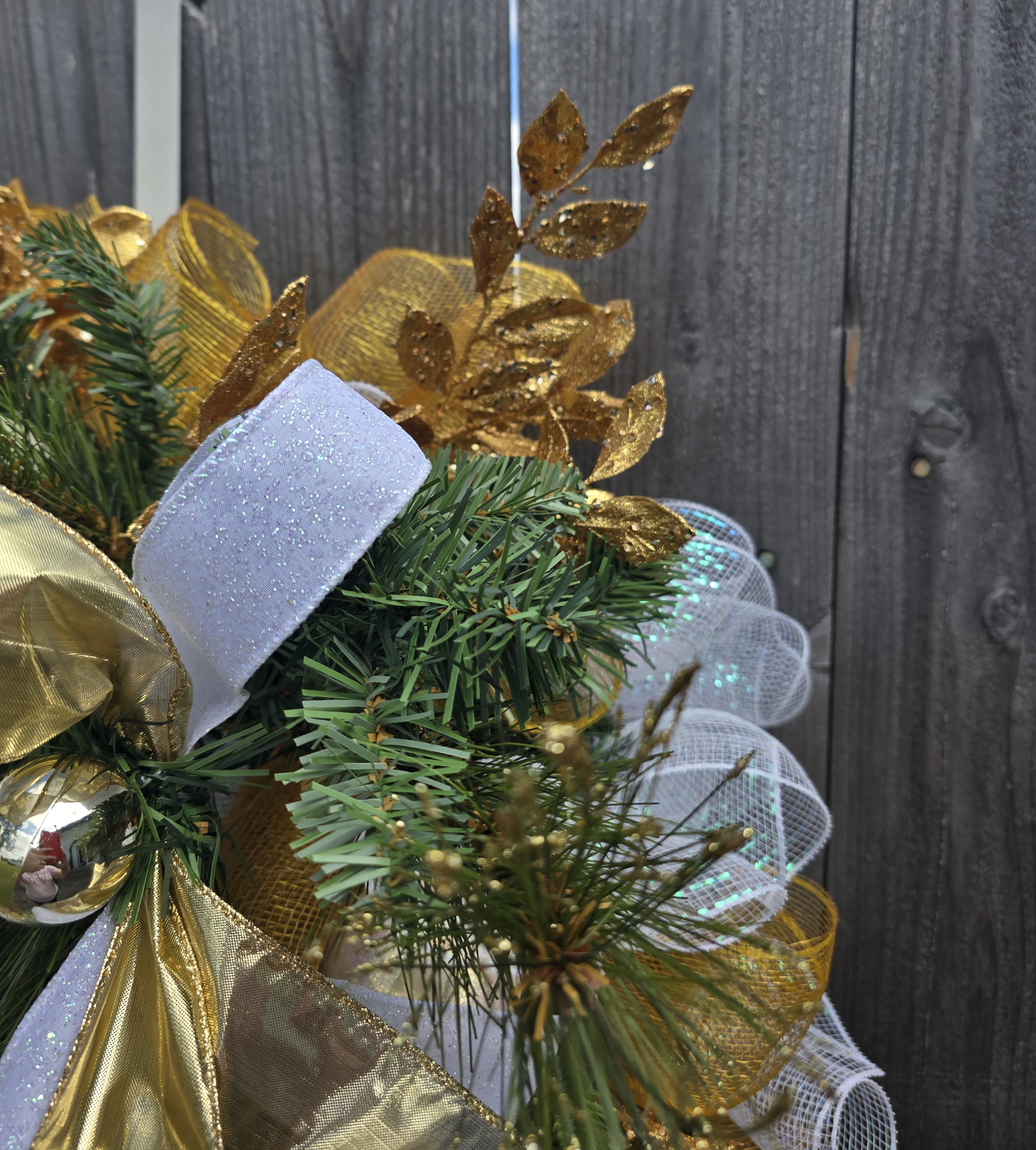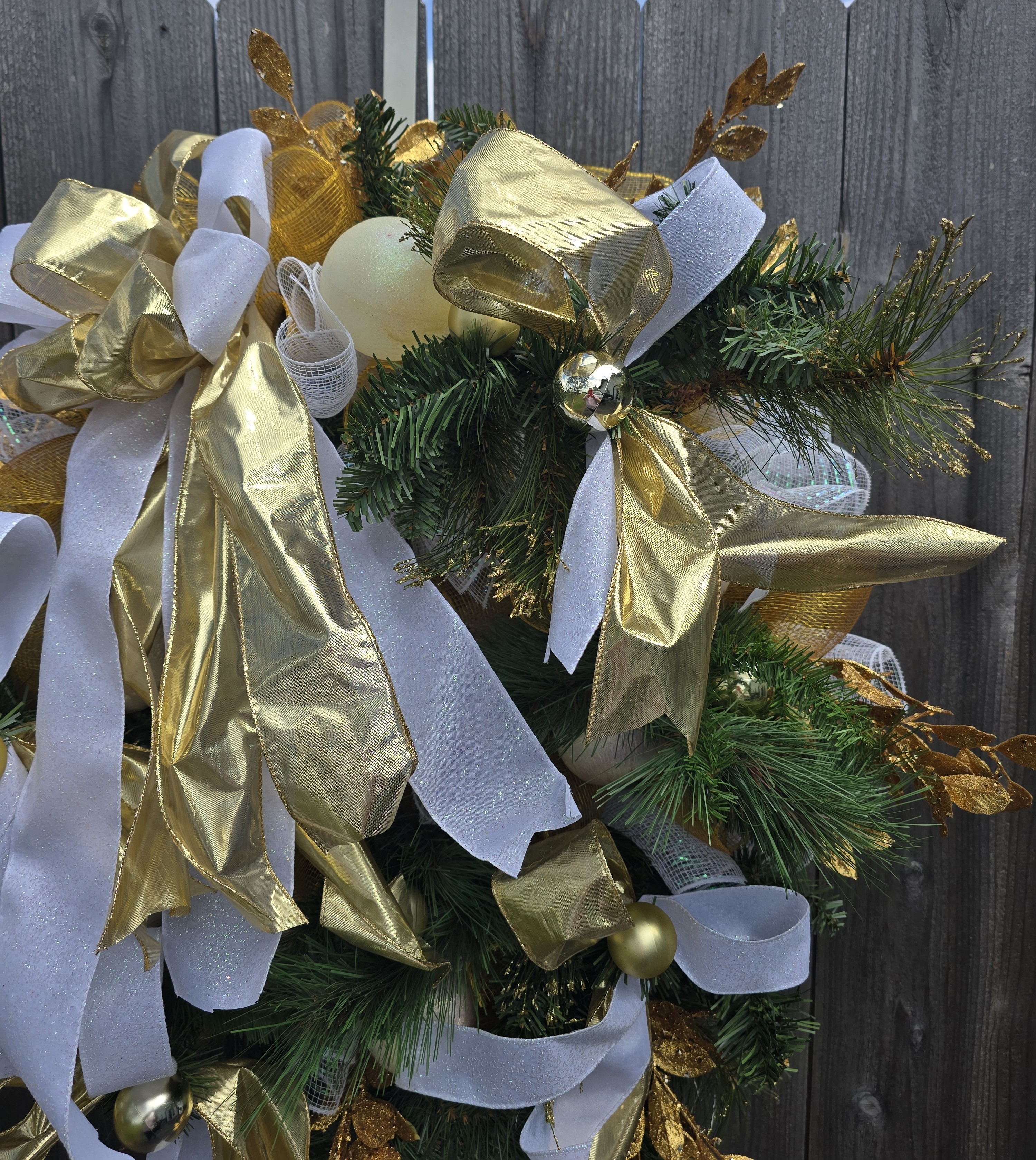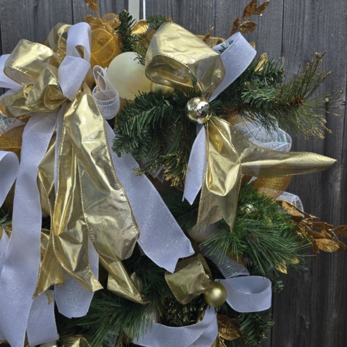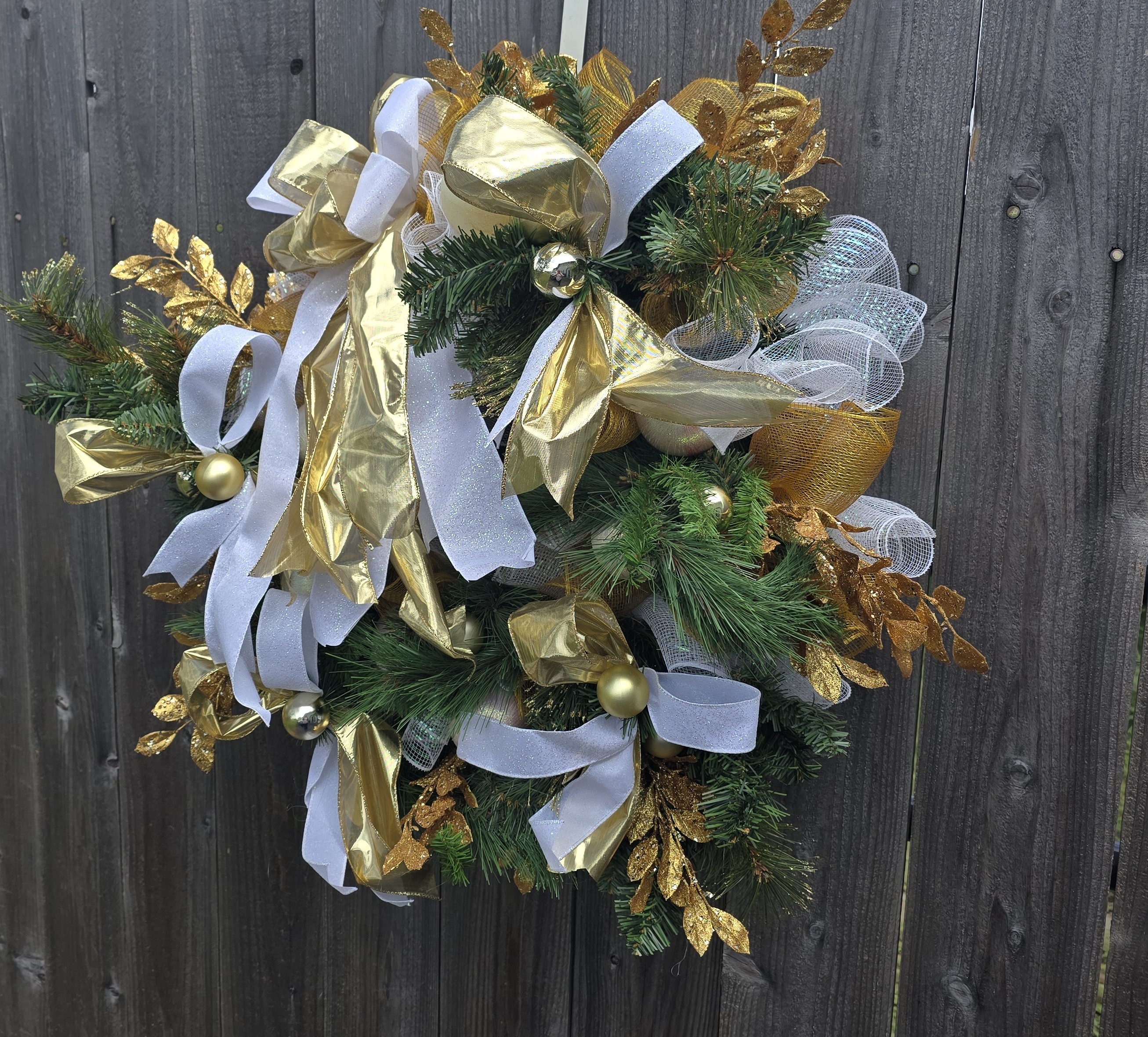 Add a touch of elegance to your holiday decor with our Gold and White Greenery Christmas Wreath. Featuring lush greenery, gold accents, and a classic design. Perfect for any home. The wreath is full of faux greenery, vintage white Christmas balls and gold balls and white and gold ribbon. It is adorned with gold, glitter smilax sprays. The wreath measures approximately 28x28x6 from tip to tip.