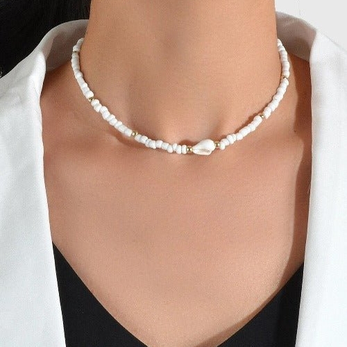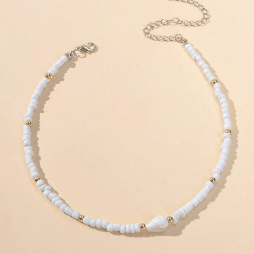 White Beaded Choker Necklace White beads with Gold accents Choker. Small conch shell finishes the look. Very Pretty! Measures 14* with 3″ extension