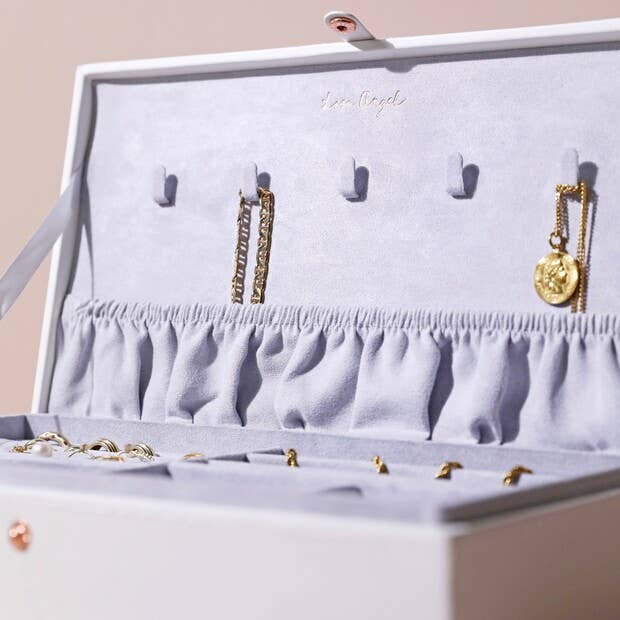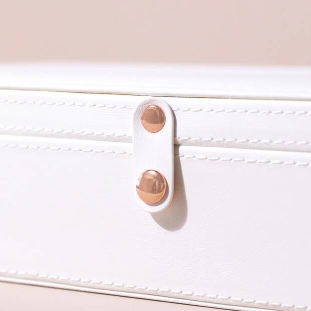 Long white jewellery box.Rose gold popper fastening.Rings rolls, sections and hooks.Dimensionswidth 27.5cm x height 6cm x depth 15cminside height – 45mmMade fromPU