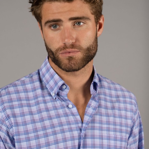 Long sleeve shirt in white with purple, lavender, navy & light blue check. The shirt has 6-way stretch and the material is 67% cotton, 30% modal and 3% elastin. SKU: 46117
