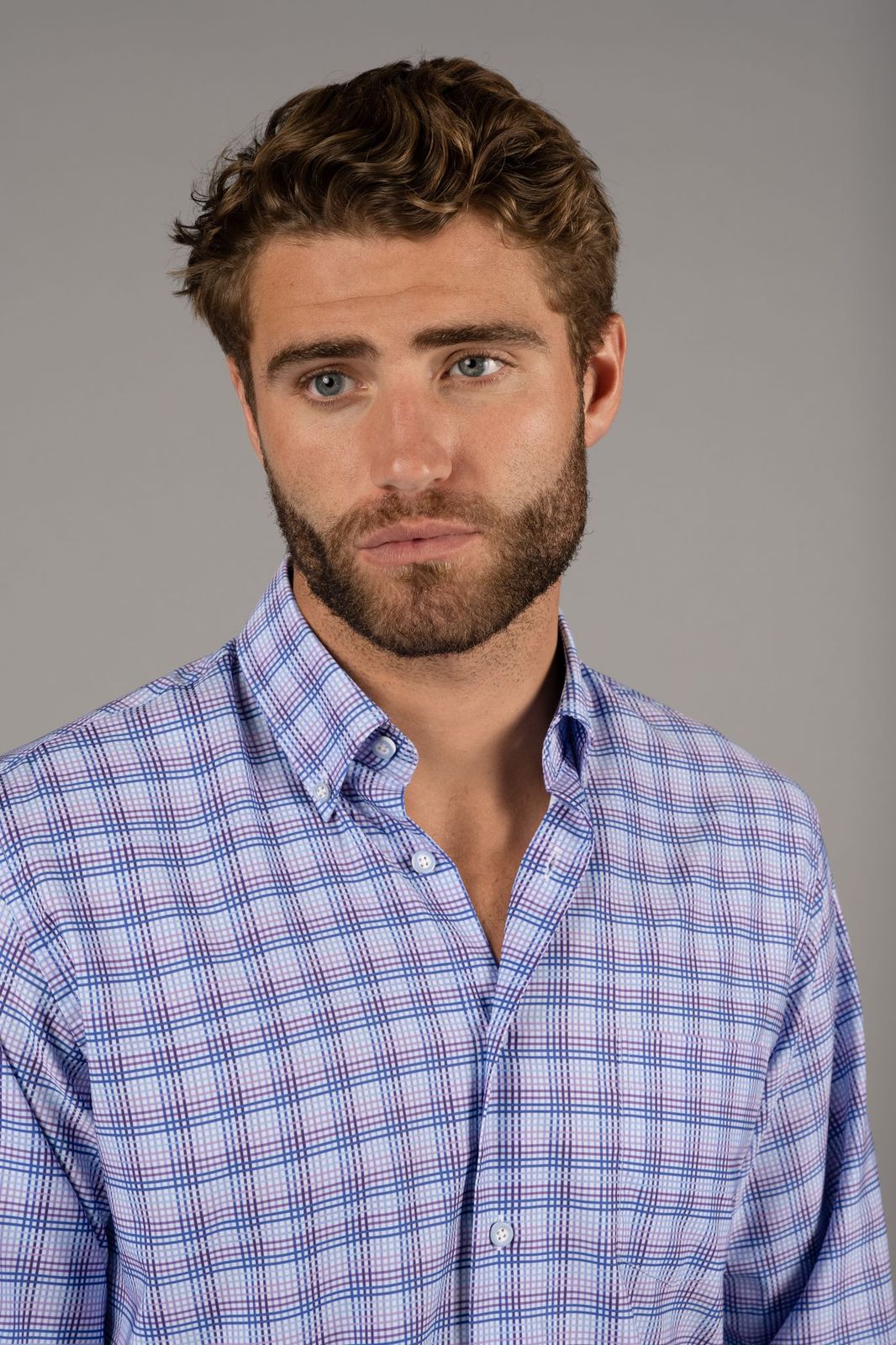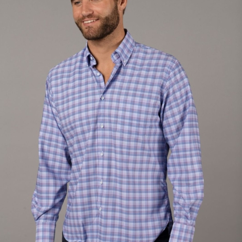 Long sleeve shirt in white with purple, lavender, navy & light blue check. The shirt has 6-way stretch and the material is 67% cotton, 30% modal and 3% elastin. SKU: 46117 BT