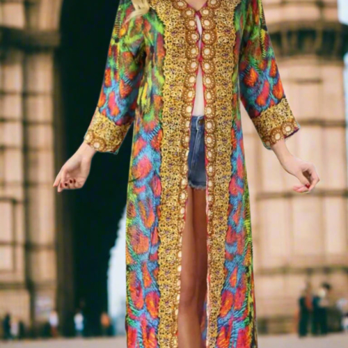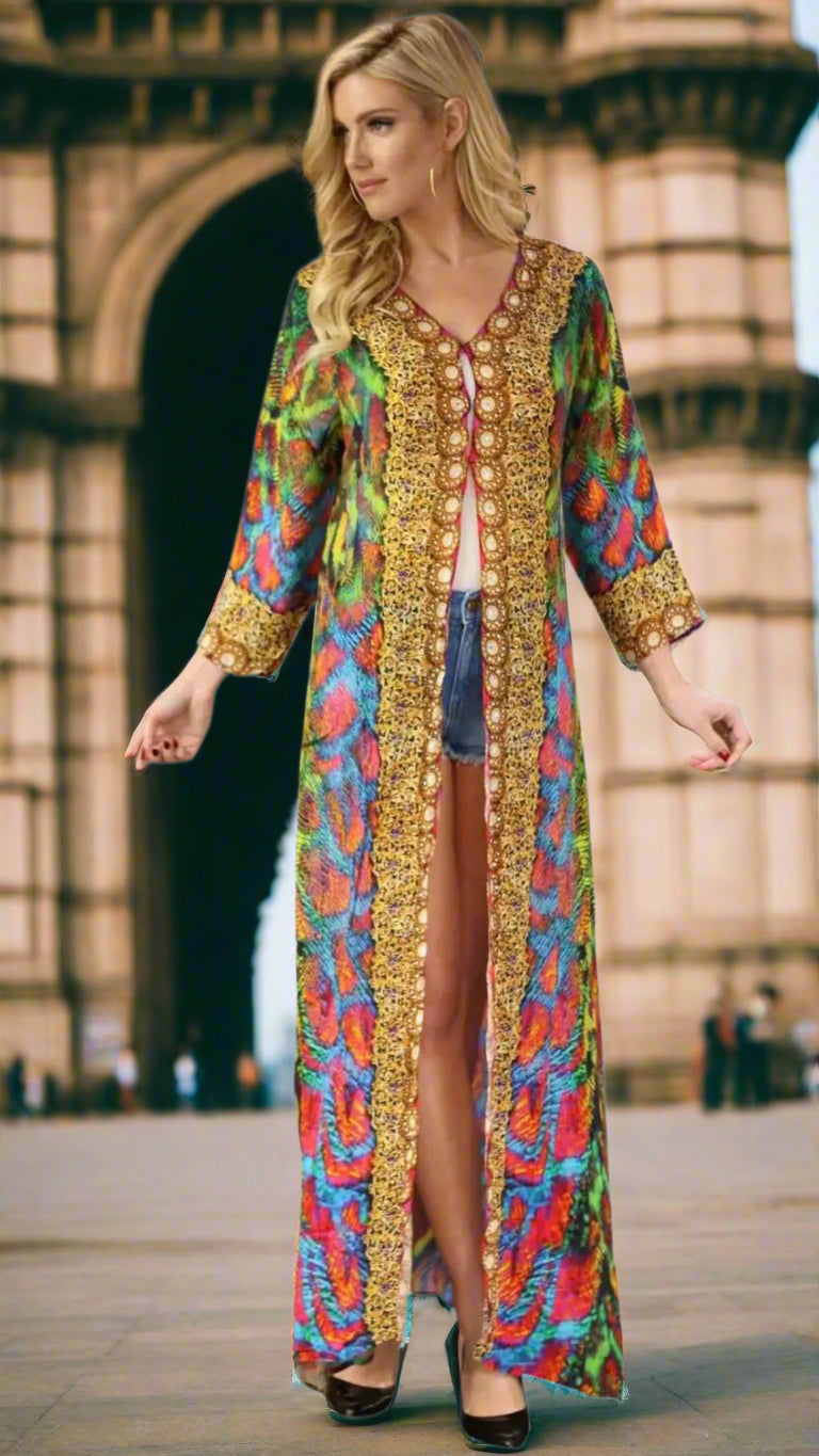 Resort Wear Cover-Up Kimonos This sexily designed beachwear cover-up gives a pee-ka-boo glance at you. Vibrantly colored, this long kimono drapes softly around you and is the perfect cover-up for your bikini. Check out the kimono collection at La Moda. Kimono, Cover Up Beachwear & Resort Wear Cover Up 100% Imported Polyester Printed / Multi-Color Size: One Size Washing Instruction: Hand Wash with Cold Water, Tumble Dry, Do not Iron Matching Swimwear Coordinated Resort Apparel La Moda Prints Material: 100% Polyester. Imported Pack Details: 4 Pcs