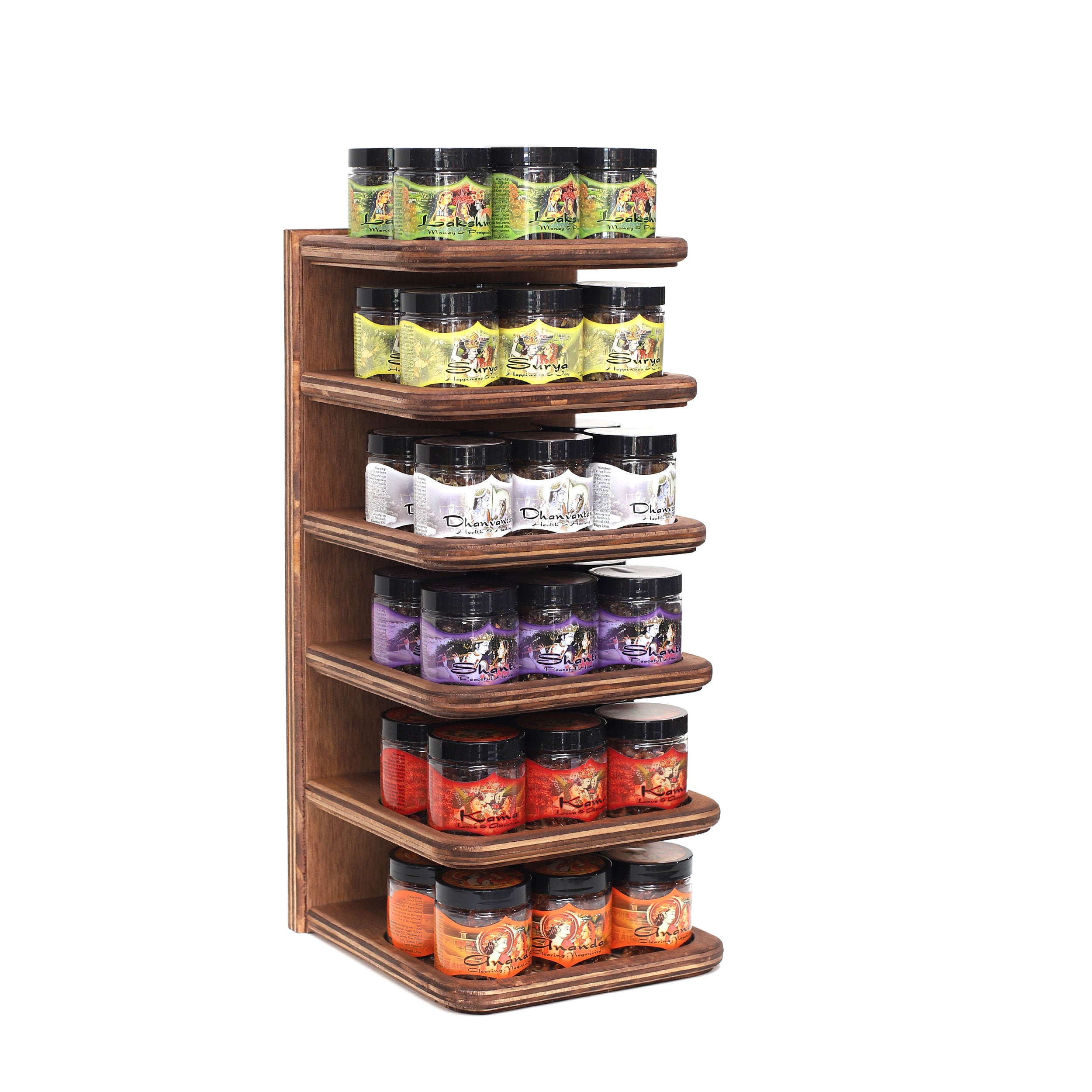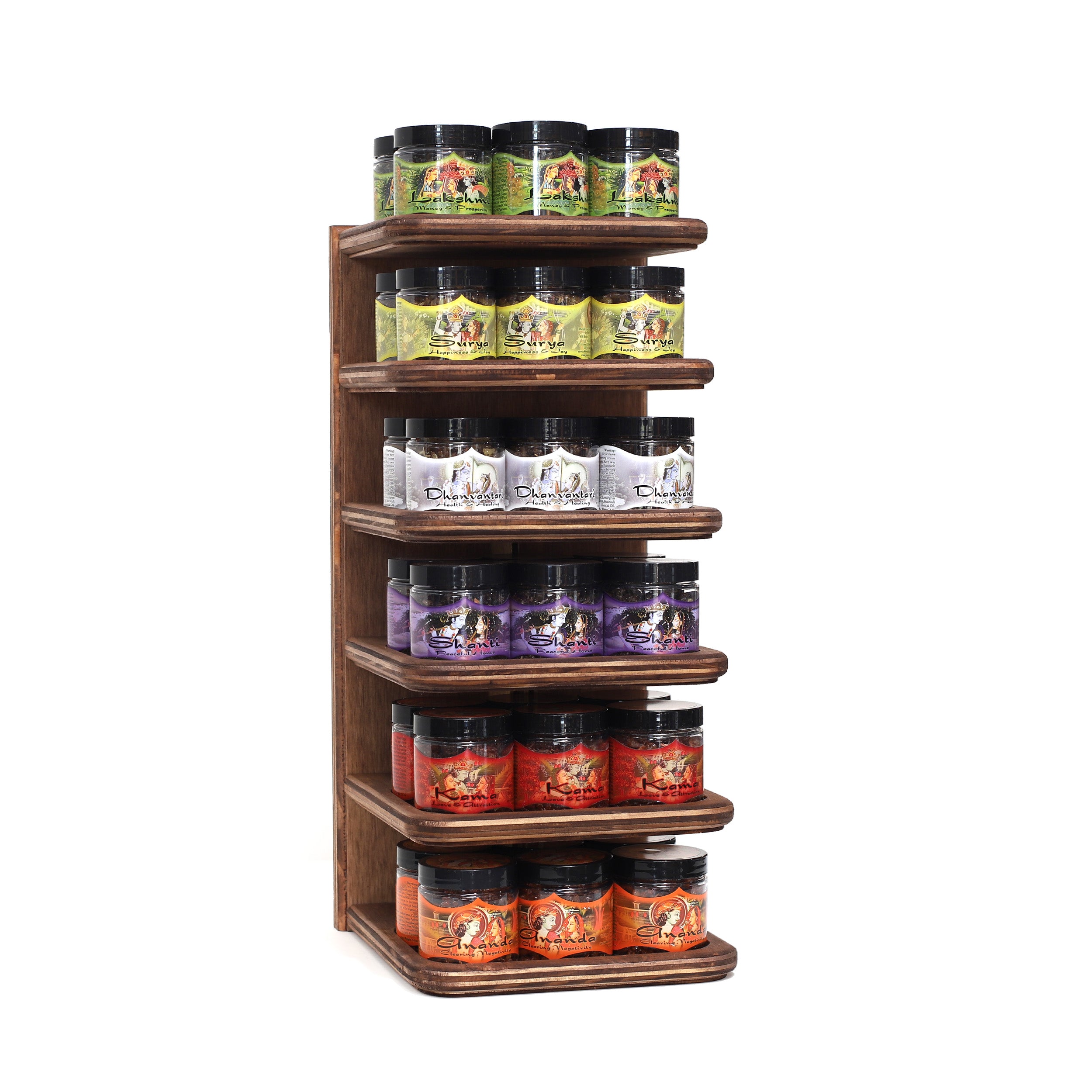 Get a FREE display rack for your store by purchasing an opening set of 36 x 2.4 oz (68 g) jars of ‘Intention Line’ Herbal Resin Incense: 6 x 2.4 oz (68 g) jars of ‘Kama’ (SKU 214-01) 6 x 2.4 oz (68 g) jars of ‘Ananda’ (SKU 214-03) 6 x 2.4 oz (68 g) jars of ‘Lakshmi’ (SKU 214-04) 6x 2.4 oz (68 g) jars of ‘Shanti’ (SKU 214-05) 6 x 2.4 oz (68 g) jars of ‘Surya’ (SKU 214-07) 6 x 2.4 oz (68 g) jars of ‘Dhanvantari’ (SKU 214-08) Total of 36 products. The rack displays the 6 scents in an organized and space-efficient manner. A 100-tear-off sheet block explaining “how to burn resin incense” is added to the initial order of an opening set of resin incense with a display rack, and can be reordered as needed (FREE for wholesale customers). The block has double-sided tape on its back to attach to your store’s Resin Incense Display or a shelf. The display rack is assembled in our facility. Allow 2 weeks + delivery time from the time of placing your order. SKU: 100-02UPC: 8-09581-10002-0Material: Pine-woodDim: 20.5”Hx8.5”Wx5.5”D