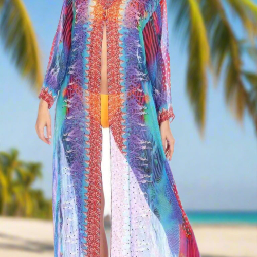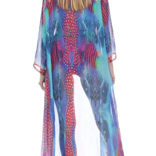 sexily designed beachwear swimwear cover-up Details: This sexily designed beachwear cover-up gives a pee-ka-boo glance at you. Vibrantly colored, this long kimono drapes softly around you and is the perfect cover-up for your bikini. Check out the kimono collection at La Moda. Kimono, Cover Up Beachwear & Resort Wear Cover Up 100% Imported Polyester Printed / Multi-Color Size: One Size Washing Instruction: Hand Wash with Cold Water, Tumble Dry, Do not Iron Matching Swimsuit Coordinated Resort Apparel Material: 100% Polyester. Imported Pack Details: 4 Pcs
