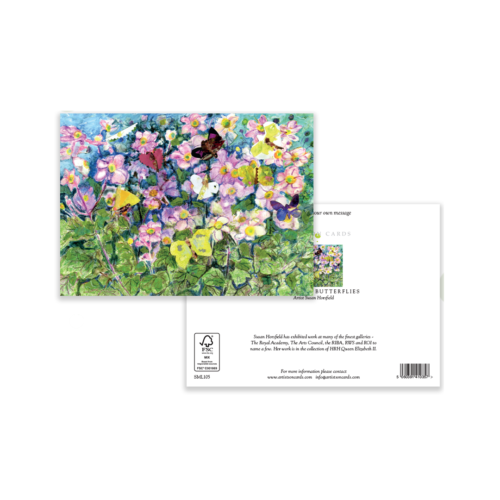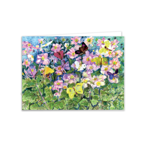 A richly textured collage and pastel design featuring butterflies among bright anemone blooms. This detailed floral art card is perfect for birthdays, thank you cards, and general occasions, making it a versatile addition to any collection.