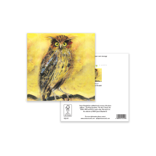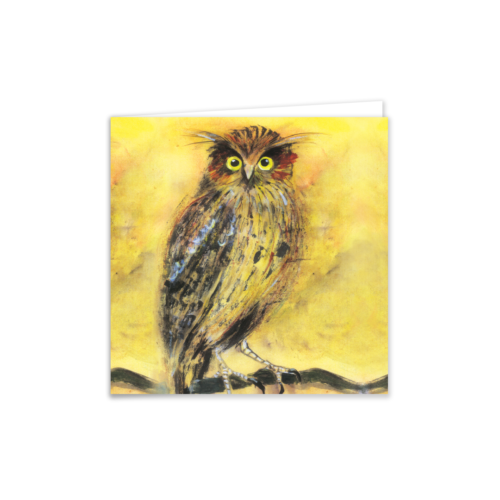 A poised brown owl perches on a branch, its bright eyes and feathery tufts painted in expressive, layered brushstrokes against a glowing yellow sky.