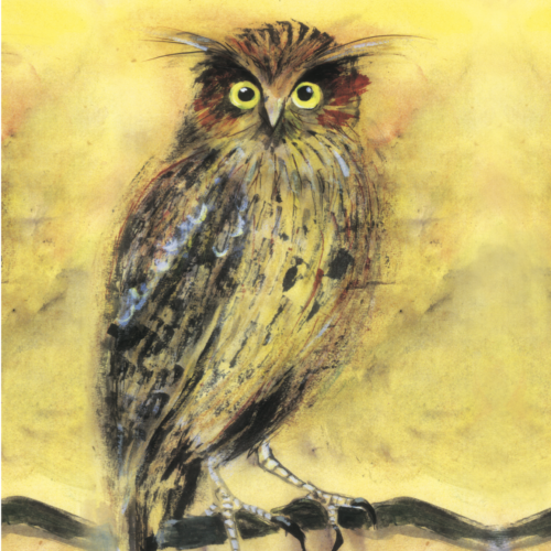 A poised brown owl perches on a branch, its bright eyes and feathery tufts painted in expressive, layered brushstrokes against a glowing yellow sky.