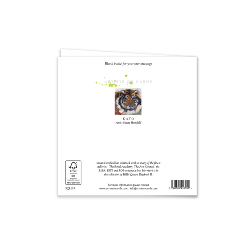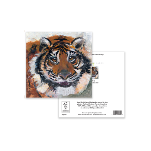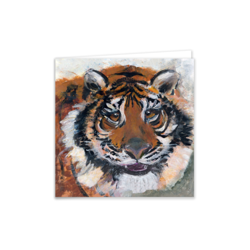 A painterly tiger art card featuring original wildlife artwork. This bold design captures the majestic beauty of the tiger, making it perfect for animal lovers, conservation supporters, and anyone who appreciates art with a wild touch. Printed in the UK on high-quality FSC-certified card, blank inside for your own personal message.