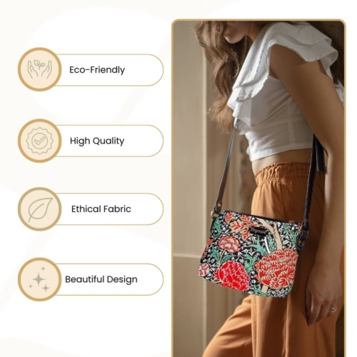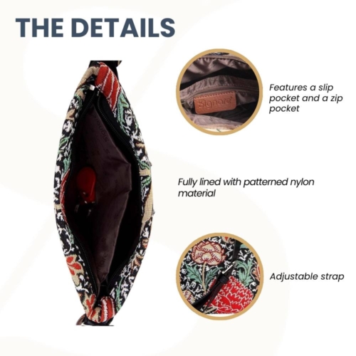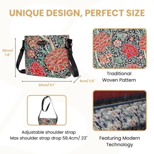 FABRIC COMPOSITION: 100% Polyester.EASY CARE: Clean it with a damp cloth. Do not soak in water.Express your individuality with Signare’s crossbody bags.[custom_html]UNIQUE LIFESTYLE DESIGN: The flourishing flowers of William Morris’ The Cray creates a swirling pattern of flora and burst of colors that are delicately woven throughout this tapestry pattern. It pairs perfectly with the William Morris art Strawberry Thief range from Signare; creating an admirable collection of art-inspired designs. Both are from the most popular William Morris designs. PRODUCT DESCRIPTION: A nifty tapestry satchel-style bag for ladies. This crossbody bag is ideal for your daily essentials and it is compactly designed in its appearance Has the option to be worn as a crossbody or converted into a handbag or shoulder style bag Fastened with a zip top; the inside features a slip pocket and zip pocket for storage; whilst also containing a modest capacity for make-up and travel accessories Fitted with an adjustable (up to 22 inches) and buckled faux leather shoulder strap Size approx. W9.1 x H 7.8 x D2.5 inches – Weight: 0.6 lb [/custom_html]