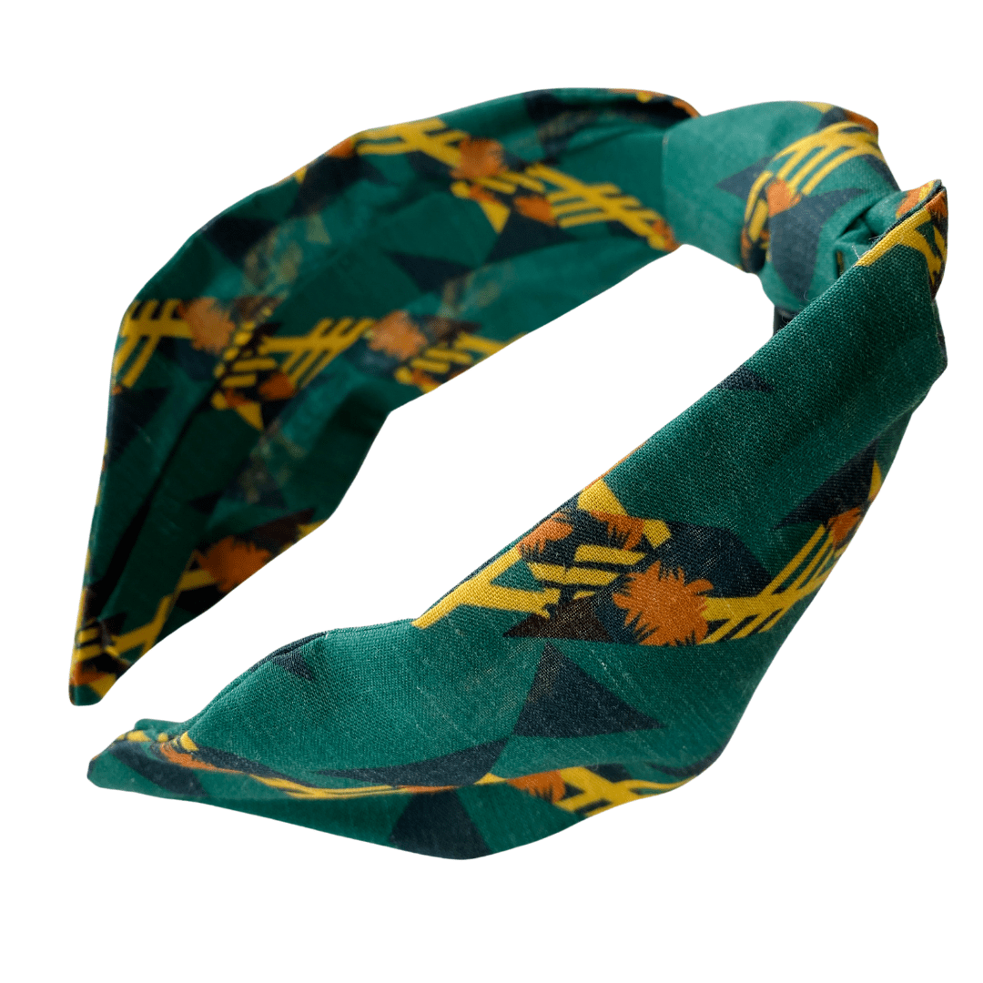 A carefully handcrafted wide knotted headband, in my limited edition Kate Whyley ‘Willow’ design, with an Autumnal/Christmas vibe – colours light pine green compliment edgy golden yellow and marigold.