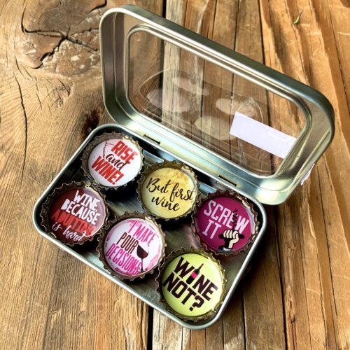 Six-pack set of wine themed magnets, made in the USA from recycled bottle caps. Our magnetic expressions make fabulous and unique gifts and can be used in the kitchen, office or on any magnetic surface. Each magnet set comes in the display tin (just like in the picture) and the magnets are strong enough to hold the entire tin on a magnetic surface for display.