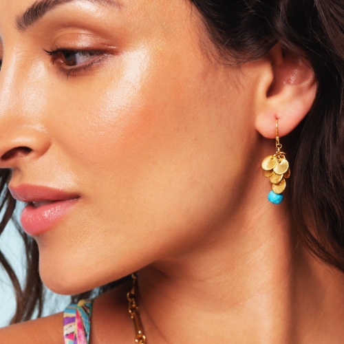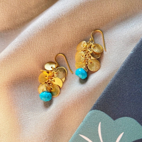 Gold disc cluster earrings with turquoise gemstones The Winona earrings are a fabulous cluster of gold brushed discs with a stunning faceted semi-precious stone drop. The cluster swings from a gold hook and catches the light with every movement. There is a small pop of colour which is subtle yet impactful.22 carat gold plated brass Turquoise gemstones Size: 3 cm Hypoallergenic sterling silver earring hooksAll Ashiana items come packaged in a branded ziplock back, with a jewellery pouch made from excess sari fabrics, and a jewellery care card.