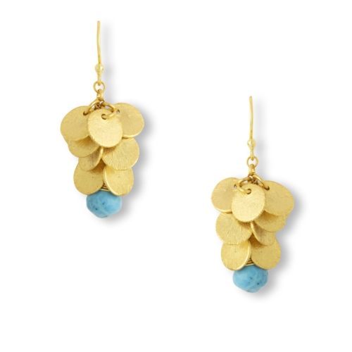 Gold disc cluster earrings with turquoise gemstones The Winona earrings are a fabulous cluster of gold brushed discs with a stunning faceted semi-precious stone drop. The cluster swings from a gold hook and catches the light with every movement. There is a small pop of colour which is subtle yet impactful.22 carat gold plated brass Turquoise gemstones Size: 3 cm Hypoallergenic sterling silver earring hooksAll Ashiana items come packaged in a branded ziplock back, with a jewellery pouch made from excess sari fabrics, and a jewellery care card.