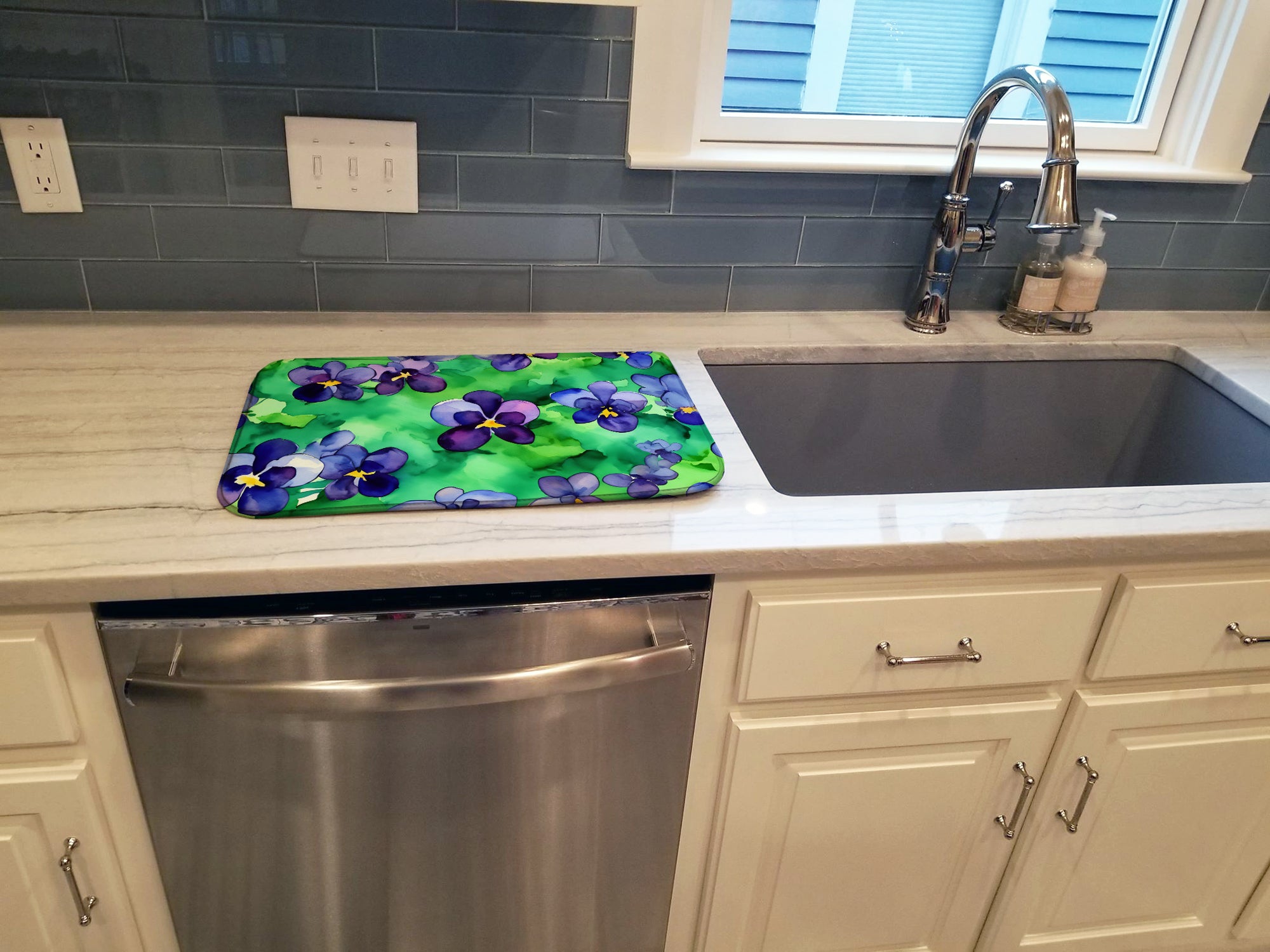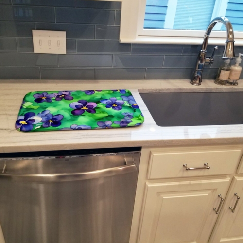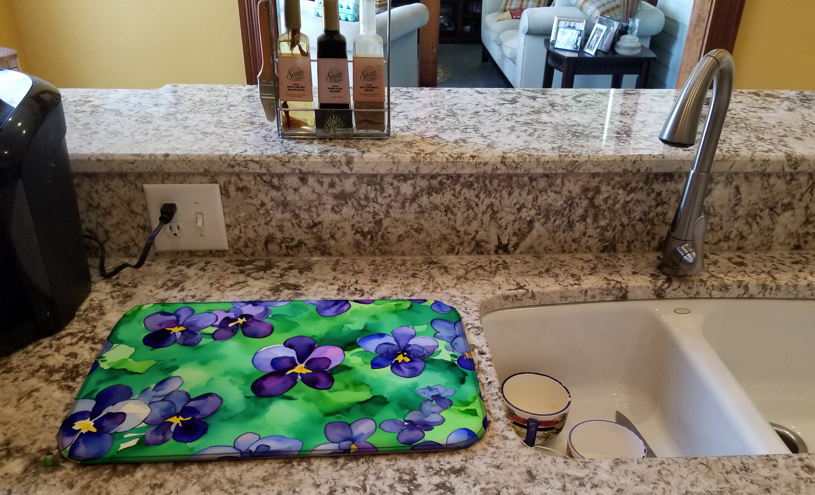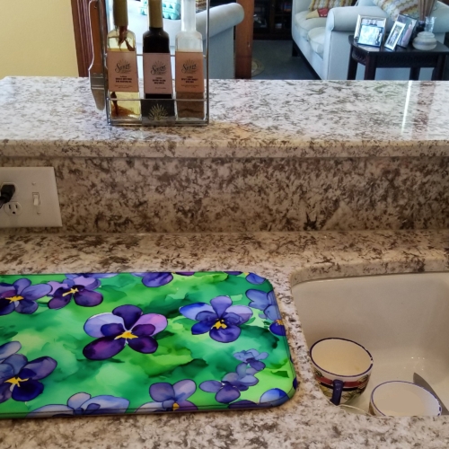 Dish Drying Mat featuring breed specific Wisconsin Wood Violets artwork. Say goodbye to messy countertops and soggy dish towels with our innovative dish drying mat. Our high-quality dish drying pad is designed to keep your countertops dry while offering a stylish and efficient solution. Whether you’re air drying dishes, glasses, stemware, silverware, pots, pans, bottles, or even fruits and vegetables, our dish mat is the perfect choice. The 14 inches x 22 inches size fits most counters and dish drying racks, and the non-slip design ensures stability. Made with water-absorbent polyester and a polyurethane foam insert, our dish drying mat is not only functional but also durable. It’s machine washable and printed in the USA for long-lasting use. The beautiful artwork adds flair to your kitchen decor, making it a perfect housewarming gift or present for any occasion. Upgrade your kitchen experience with our absorbent and versatile dish drying mat.