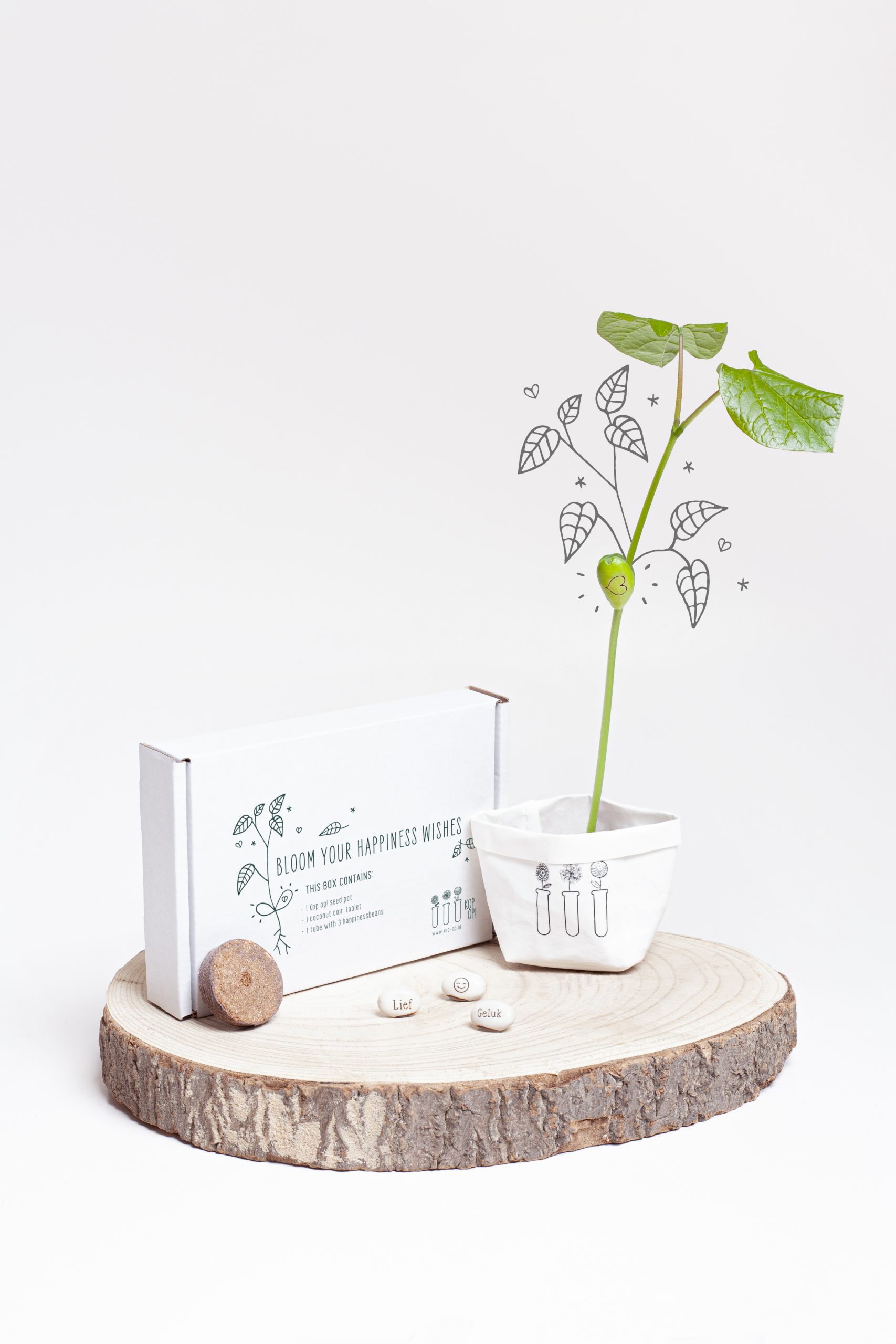 But what can you do with those beans? Very simple … Add water to the coconut earth tablet and put the soil in the Kop! seed pot. Make a small hole in the earth and place the wish bean on the earth. Give a little water every 3 days and after a little week you will see your wish grow. The best thing about this wish is that the bean text will remain on the first leaves of the plant 🙂